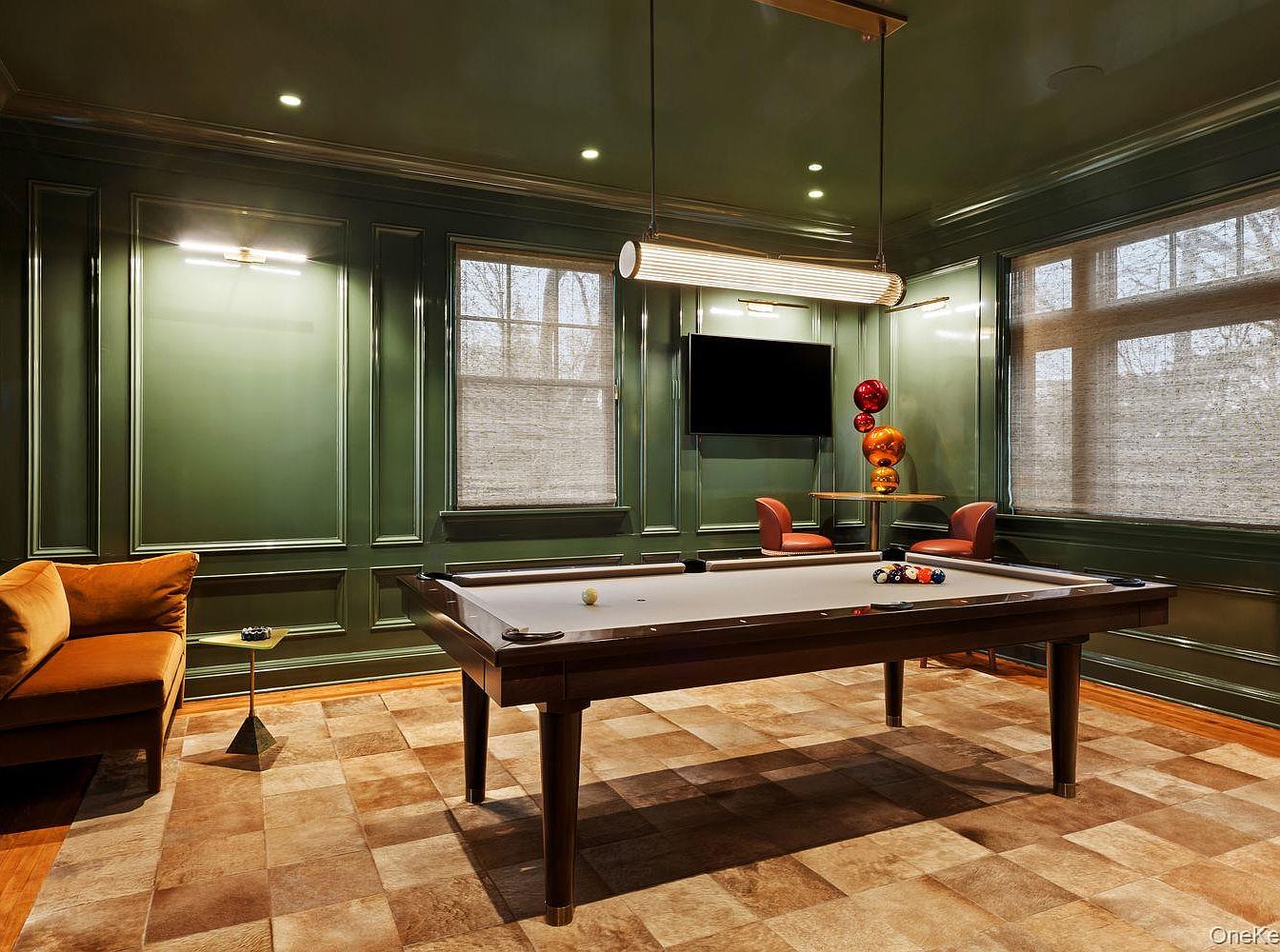 A sophisticated billiards game room designed for relaxation and family fun, featuring lush green paneled walls and a soft amber sectional for cozy gatherings. The space offers a large central pool table under modern, streamlined lighting, complemented by warm, earth-tone tile flooring. A small round table with two leather chairs provides a perfect corner for games or snacks, while large windows let in natural light, maintaining a bright yet intimate atmosphere. Elegant details, such as the wall molding and playful sculptural decor, enhance the inviting feel, creating an ideal hub for game nights and quality family time.