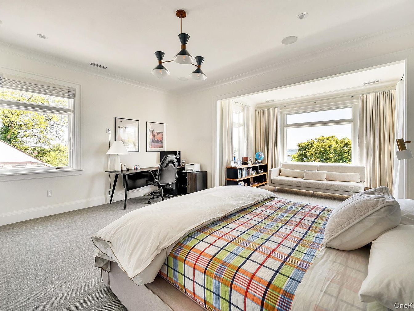This spacious primary bedroom suite features an inviting layout with a king-sized bed adorned in a colorful plaid quilt at its heart. Soft neutral tones on the walls and carpet complement the abundance of natural light streaming from two large windows and a bright windowed alcove, creating a fresh and airy ambiance. A functional workspace offers a modern desk and swivel chair, perfect for remote work or study within the comfort of the home. The secondary sitting area, accented by a plush sofa and a cozy bookshelf, provides a family-friendly reading nook or play spot, while elegant contemporary lighting and layered curtains add warmth and sophistication.