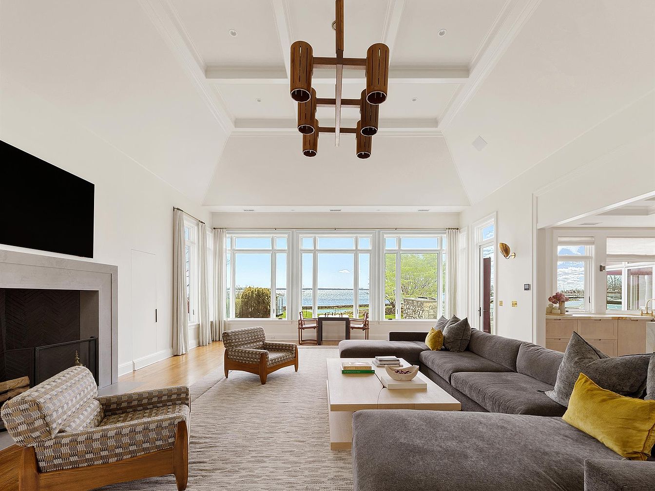 A spacious and airy living room features large floor-to-ceiling windows that fill the space with natural light and offer stunning views of the outdoors. The layout includes a plush sectional sofa in deep gray tones, complemented by two stylish armchairs with patterned upholstery and wooden frames. A soft neutral area rug centers the seating arrangement, ideal for family gatherings or relaxing evenings. Light, neutral walls, wood flooring, and high coffered ceilings with an eye-catching modern chandelier create a warm yet sophisticated aesthetic. The open flow to the adjacent kitchen and expansive windows enhance the welcoming, family-friendly atmosphere.