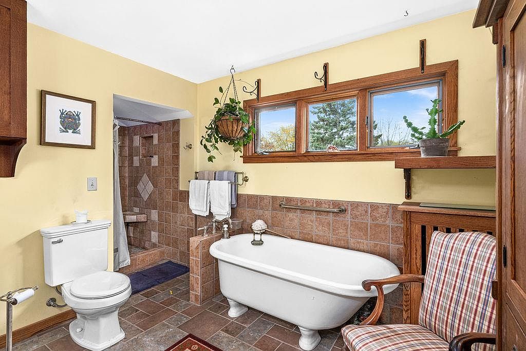 This inviting bathroom blends vintage charm with modern touches, showcasing a spacious layout highlighted by a freestanding clawfoot tub, perfect for relaxation. The rich earthy tones of the tiled floor and walls create a warm atmosphere, complemented by the soft yellow paint, enhancing natural light from several windows. Functional features, like a walk-in shower with elegant tilework and a stylish wooden vanity, ensure convenience. Thoughtfully placed plants add a refreshing touch of greenery, making the space feel serene and welcoming. The blend of classic and contemporary elements makes it a family-friendly sanctuary for everyday indulgence.