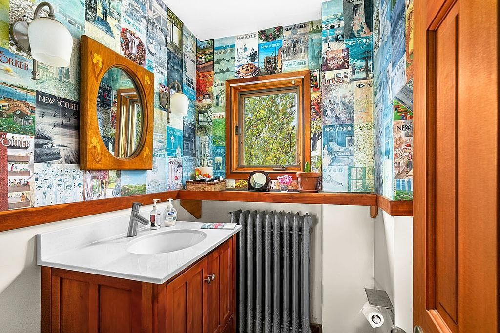 Featuring a unique blend of artistic expression and functionality, this bathroom showcases walls adorned with colorful vintage magazine covers, creating a vibrant and energizing atmosphere. The warm wood tones of the cabinetry and trim provide a cozy contrast to the playful wall decor. A circular mirror framed in wood complements the aesthetic while maximizing natural light from the window, which overlooks lush greenery. The sleek white countertop and modern fixtures add a touch of elegance, making the space both practical and welcoming. Family-friendly elements include ample counter space and thoughtful storage, catering to daily routines.