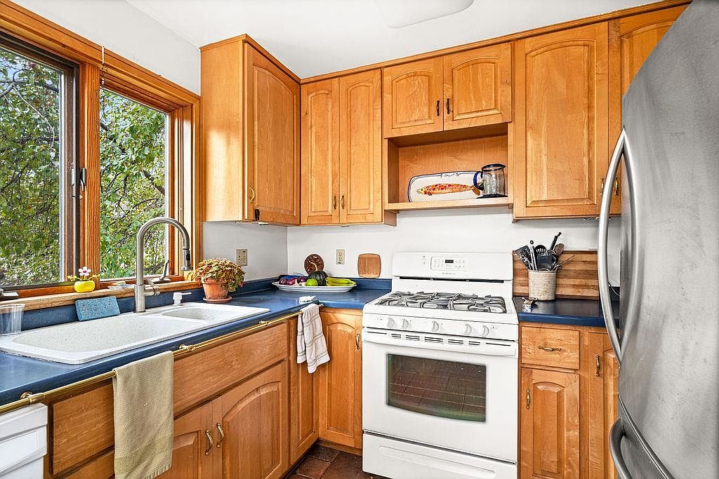 This inviting kitchen features a warm palette of light wood cabinetry paired with a deep blue countertop, creating a charming yet functional atmosphere. The spacious layout encourages family interaction, with ample natural light flooding in through the large windows. A double basin sink positioned beneath the window allows for scenic views while cleaning up. Equipped with modern appliances, including a stylish stainless steel refrigerator and a gas stove, this kitchen is perfect for culinary adventures. Thoughtfully organized shelves and a subtle decor enhance the cozy feel, making it a welcoming hub for meal preparation and family gatherings.