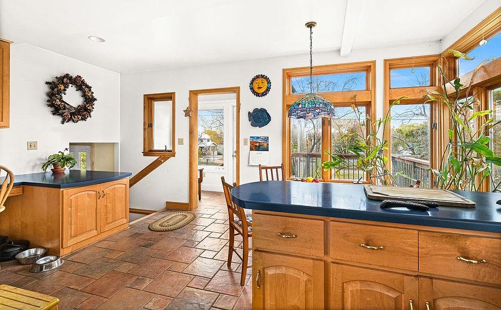 This inviting kitchen features a spacious layout with warm wooden cabinetry and a striking dark countertop that contrasts beautifully with the light walls. Natural light floods the area through expansive windows, creating a cheerful atmosphere perfect for family gatherings. A colorful stained glass pendant light adds a unique touch above the central island, enhancing the vintage charm. Family-friendly elements like accessible seating and an open connection to the outdoor space encourage interaction. The earthy tile flooring brings warmth, while decorative accents, such as a wreath and potted plants, provide a cozy, welcoming feel that makes this kitchen a heart of the home.