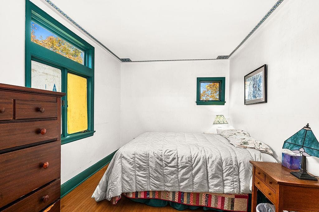 This charming bedroom features a warm and inviting layout, highlighted by rich, dark wood furniture against crisp white walls. A plush, queen-size bed is adorned with soft linens, complemented by a vibrant quilt, bringing a touch of color. Architectural details include deep green window frames and trim, adding a classic character. Ample natural light filters through the two large windows, enhancing the cheerful ambiance. The room’s family-friendly features include sturdy furniture and practical flooring. A bedside table with a stylish lamp offers convenience, while framed artwork adds a personal touch, making the space feel like a welcoming retreat.
