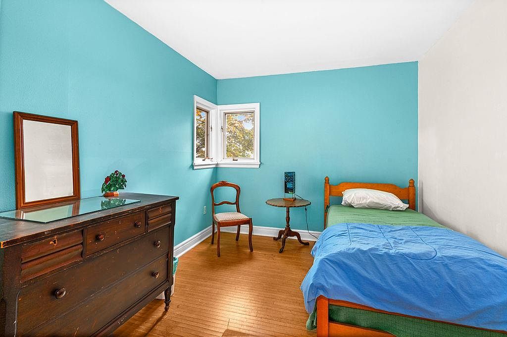 This charming kid’s bedroom features a refreshing turquoise accent wall that instantly brightens the space. A cozy single bed dressed in green and blue linens invites relaxation, while the hardwood flooring adds warmth and durability. A vintage-style dresser provides ample storage, enhancing the room’s functionality, paired with a simple chair for study or reading. Natural light pours in through the unique windows, creating a cheerful atmosphere, while a small side table displays decorative touches. The combination of colors and classic furnishings cultivates a welcoming, family-friendly environment, ideal for creativity and restful nights.