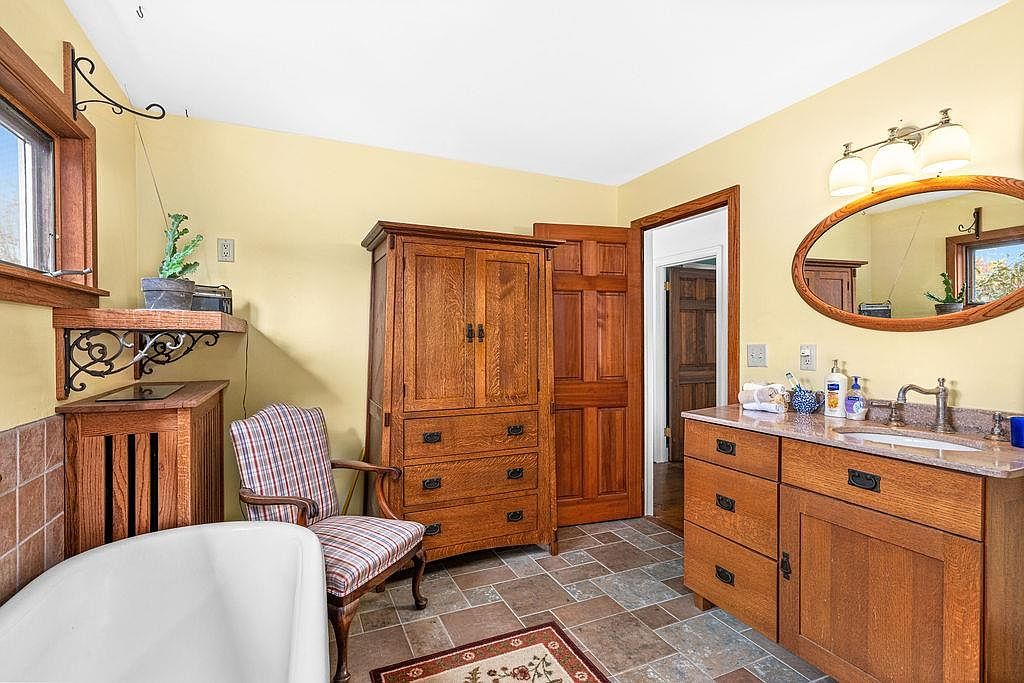 This inviting bathroom features warm yellow walls that create a soothing ambiance. A spacious, clawfoot tub beckons relaxation, while natural light pours in through the windows, illuminating the rich wood accents. A sturdy wooden armoire stands prominently, paired with a rustic vanity that boasts a polished countertop and ample storage space. The checkered armchair offers a cozy nook, perfect for comfort. Slate tiles add a touch of elegance to the floor, harmonizing beautifully with the wooden furniture. Family-friendly details, such as easy access to toiletries and functional design, make this space both stylish and practical for everyday use.