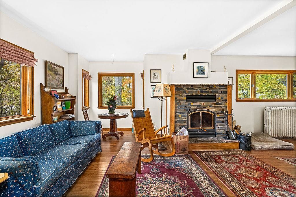 This inviting living room features a spacious layout bathed in natural light, thanks to the ample windows that frame scenic views. The central stone fireplace serves as a warm focal point, complemented by wooden trim throughout. A rich color palette of deep blues and warm earth tones contributes to a cozy, family-friendly atmosphere. Comfortable, patterned upholstery adorns the sofa, while a rustic wooden coffee table adds functional charm. An accent chair and stylish lamp create additional seating, perfect for gatherings. The hardwood floors and area rugs enhance the warmth, making this space ideal for relaxation and connection.