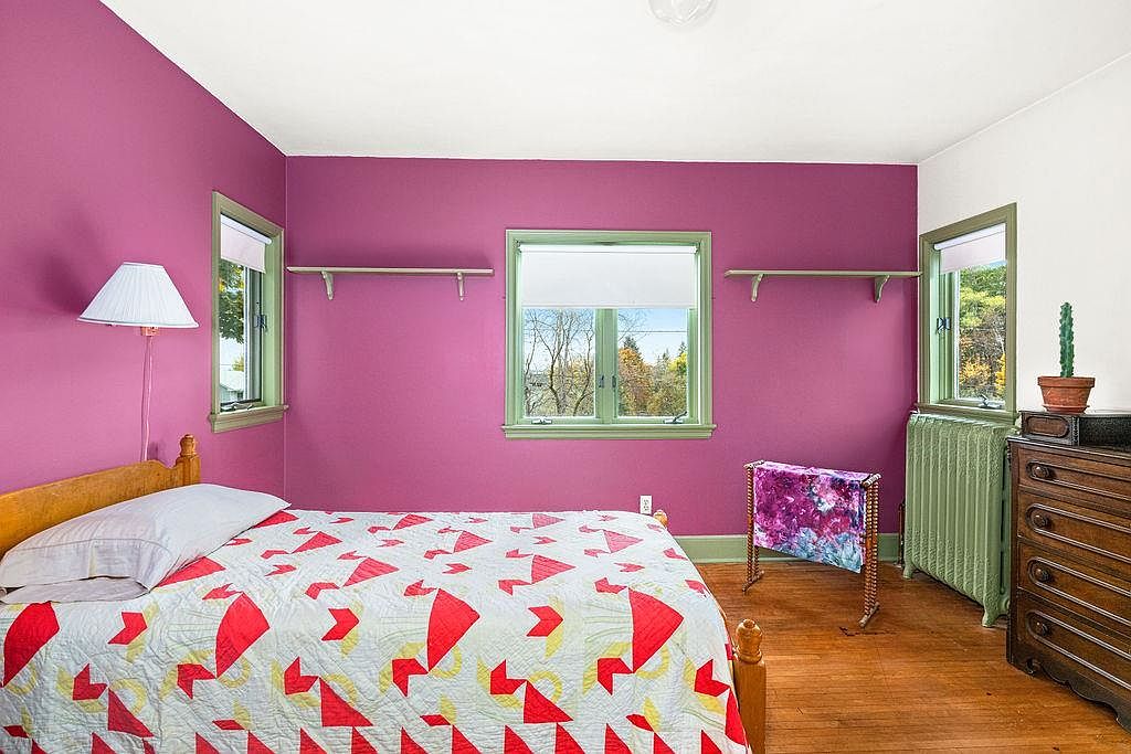 This vibrant kid’s bedroom showcases a playful design with its bold purple accent wall, creating an inviting and energizing atmosphere. A cozy wooden bed adorned with a colorful quilt offers a cheerful focal point. Light streams in through two large windows, highlighted by green trim, enhancing the room’s brightness. A functional shelf above adds storage for books or decorative items, while a compact chair with a unique fabric adds character. The brown hardwood flooring complements the space, paired with a quaint dresser that provides extra storage. Overall, this room blends comfort with joyful aesthetics, perfect for children.