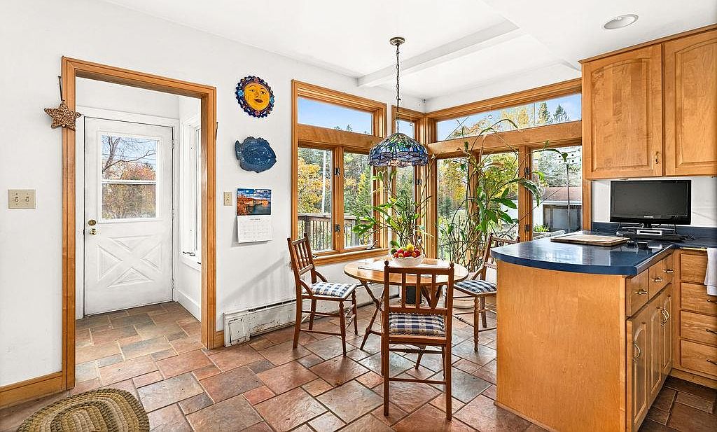 This charming breakfast nook invites warmth and connection, featuring a round table surrounded by rustic wooden chairs with plaid cushions. Natural light floods the space through expansive windows, showcasing vibrant autumn foliage. The cozy tile flooring complements the honey-toned cabinetry, while the stained-glass pendant light adds a touch of elegance. A vibrant sun motif hangs on the wall, contributing to the inviting atmosphere. A corner with a small TV and plants enhances the family-friendly essence, making it an ideal spot for casual meals and morning conversations. This nook seamlessly blends functionality with aesthetic charm, perfect for everyday living.