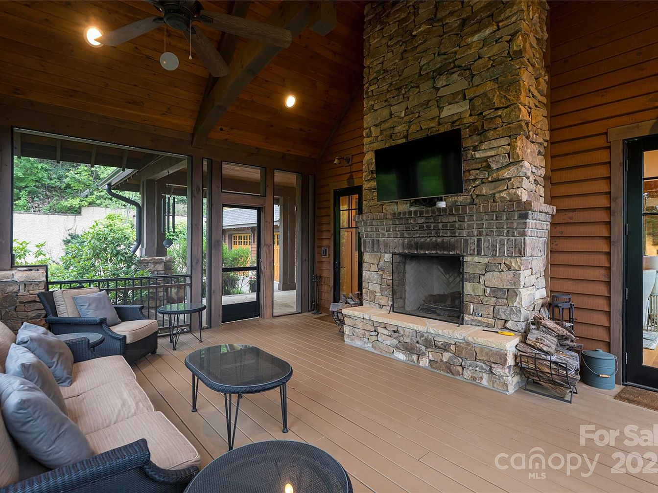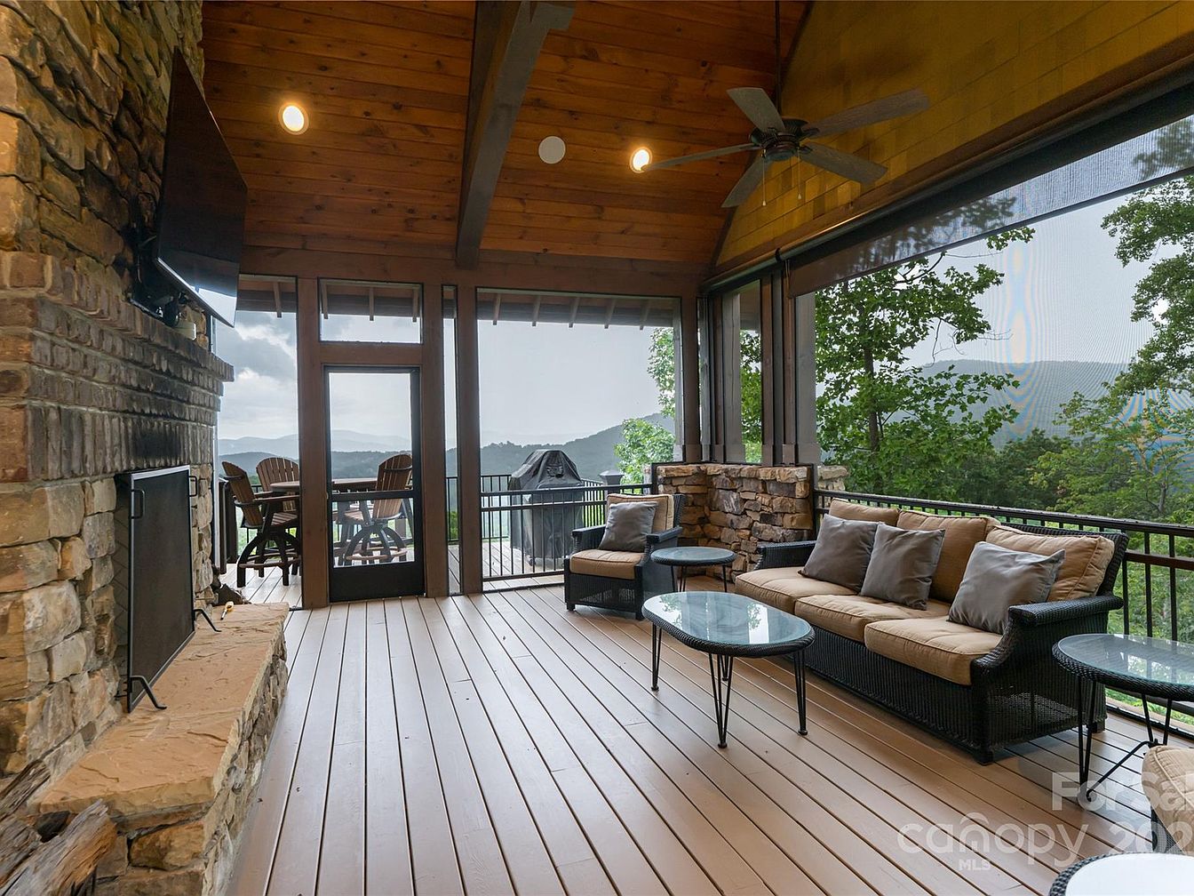 A spacious covered patio framed by natural stone columns and featuring a cozy stone fireplace creates the perfect family gathering space with panoramic mountain views. Warm wooden ceilings and wide plank floors add an inviting rustic charm, while the plush outdoor wicker sofa and armchairs, arranged around glass-top tables, offer comfort and relaxation for all ages. Large ceiling fans ensure cool breezes during summer months. With an easy flow to the adjacent grill and intimate dining set, this veranda balances style and function, making it ideal for both quiet evenings and lively outdoor entertaining in a serene, natural setting.
