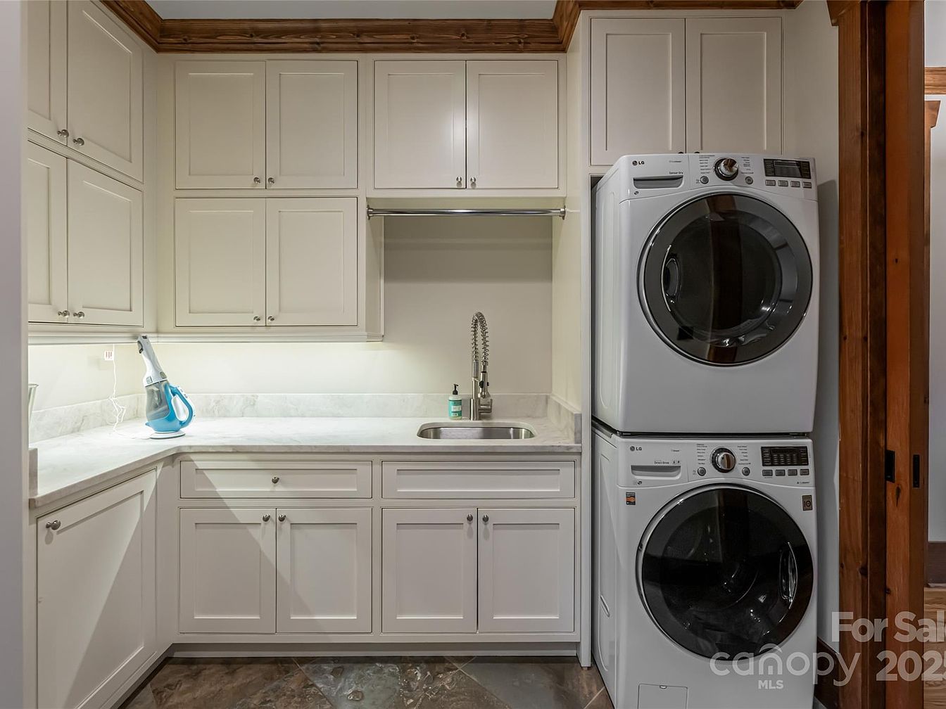 A spacious and thoughtfully designed laundry room features stacked washer and dryer units, optimizing vertical space and making laundry routines more efficient for busy families. Expansive cream-colored cabinetry lines the walls, providing abundant storage for essentials and keeping the area clutter-free. The U-shaped marble countertop offers ample room for folding and sorting clothing, while under-cabinet lighting ensures a bright, cheerful work environment. A deep stainless-steel sink with a modern faucet makes soaking and hand-washing easy. Warm wooden trim and stone-look tile flooring balance contemporary practicality with inviting, family-friendly charm, making this space as beautiful as it is functional.