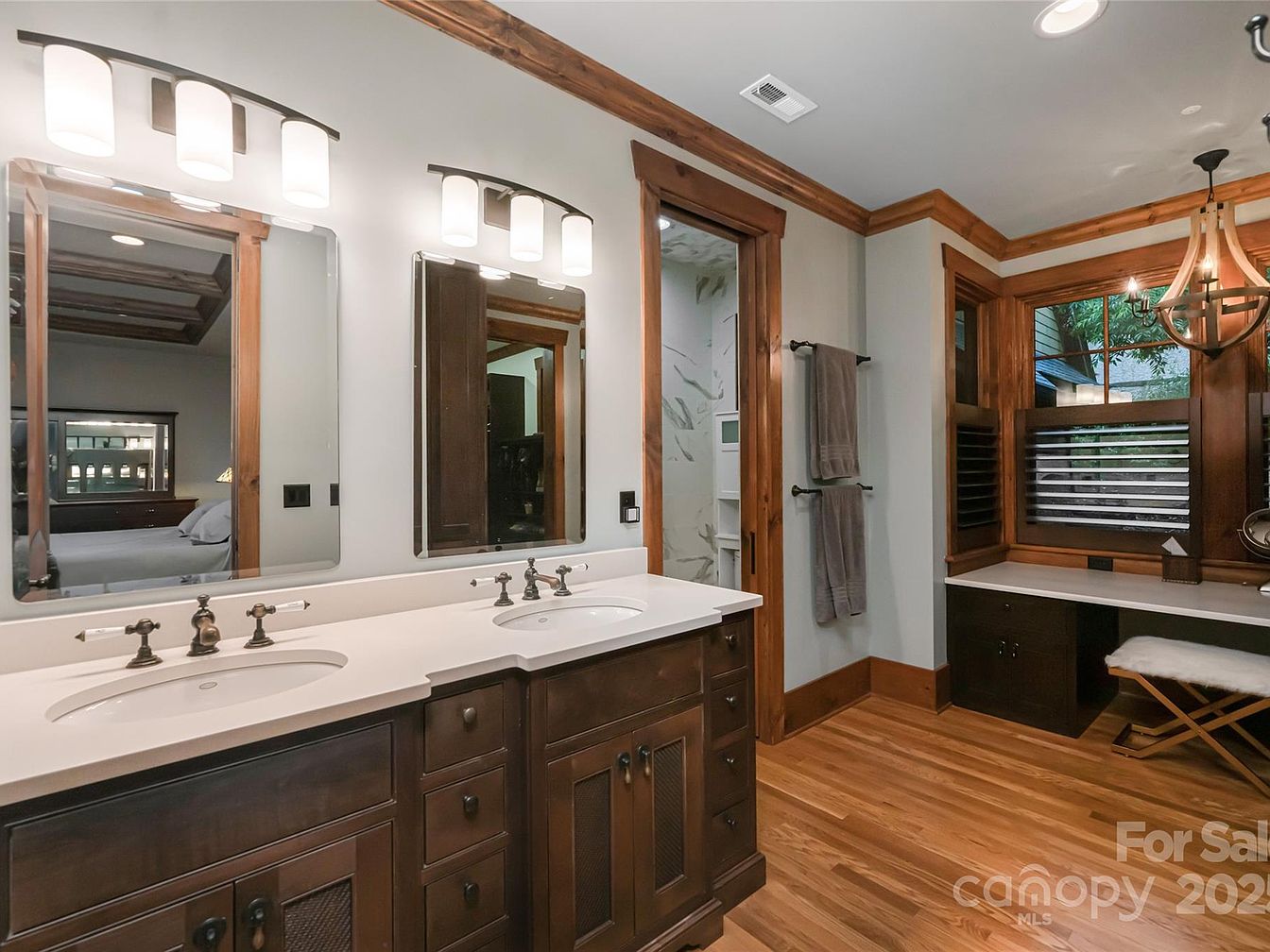 Warm natural wood trim frames the serene master bathroom, featuring a spacious double-sink vanity with rich cabinetry and modern bronze fixtures. Ample counter space and well-lit mirrors ensure comfort for daily routines, while soft overhead and wall lighting adds a welcoming ambiance. The layout prioritizes family convenience, offering dual towel racks and direct access to the shower area, making busy mornings seamless. An inviting built-in makeup or work station sits beneath large picture windows with plantation shutters, providing privacy and natural light. The calming neutral color palette, hardwood flooring, and tasteful accents create a relaxing, timeless atmosphere ideal for families.