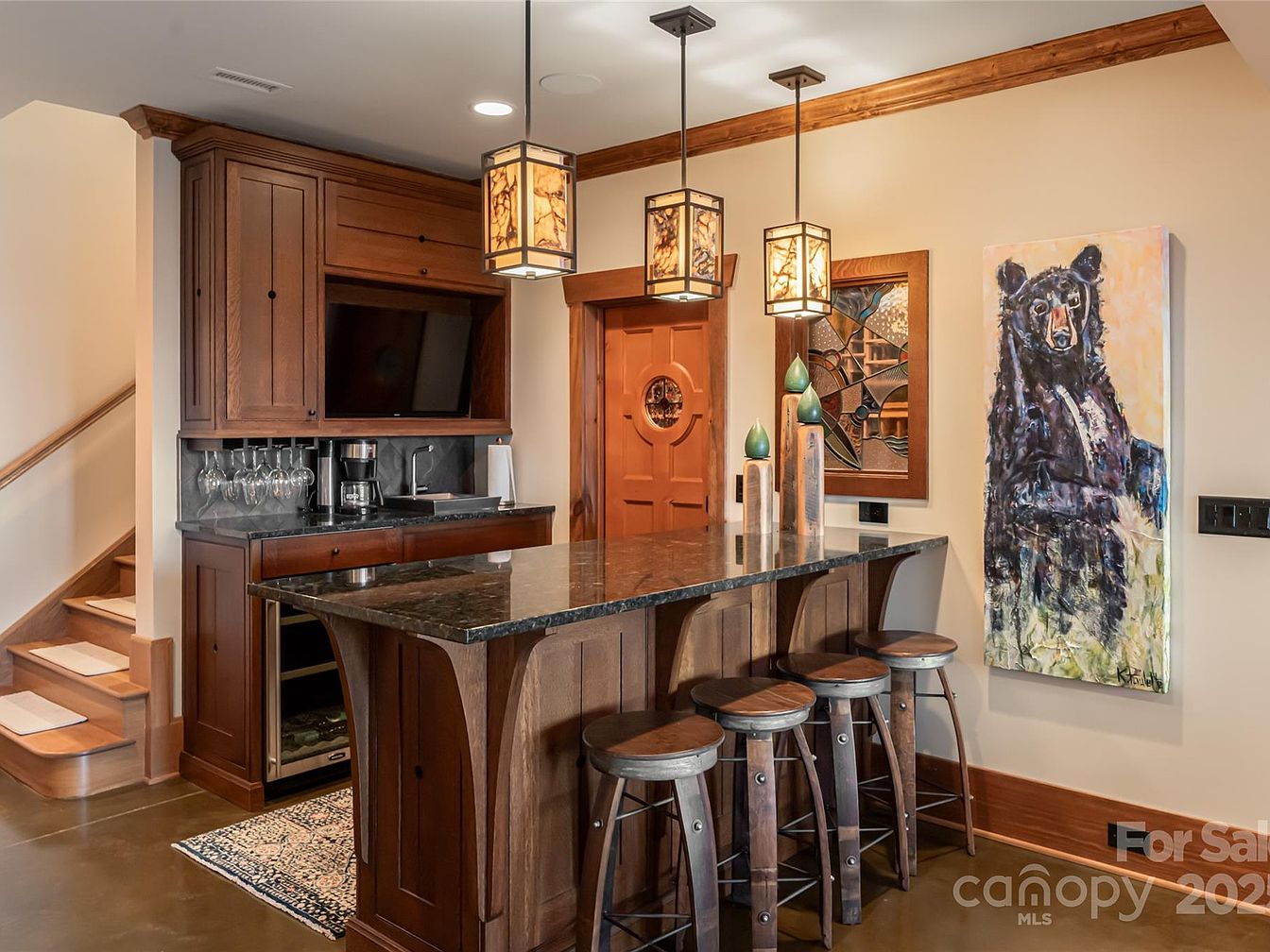 This cozy home bar corner seamlessly combines rustic charm with modern flair, making it ideal for family gatherings and entertaining guests. Beautifully crafted rich wood cabinetry, paired with a sleek dark granite countertop, offers ample space for mixing drinks or serving snacks. Four sturdy wooden stools line the bar, inviting casual conversation. The soft, warm lighting from the geometric pendant lights sets a welcoming mood. Artistic touches, including a bold bear painting and intricate wall art, add personality. Practical features like under-cabinet glass storage, a built-in wine fridge, and a coffee station make this space both functional and inviting for all ages.