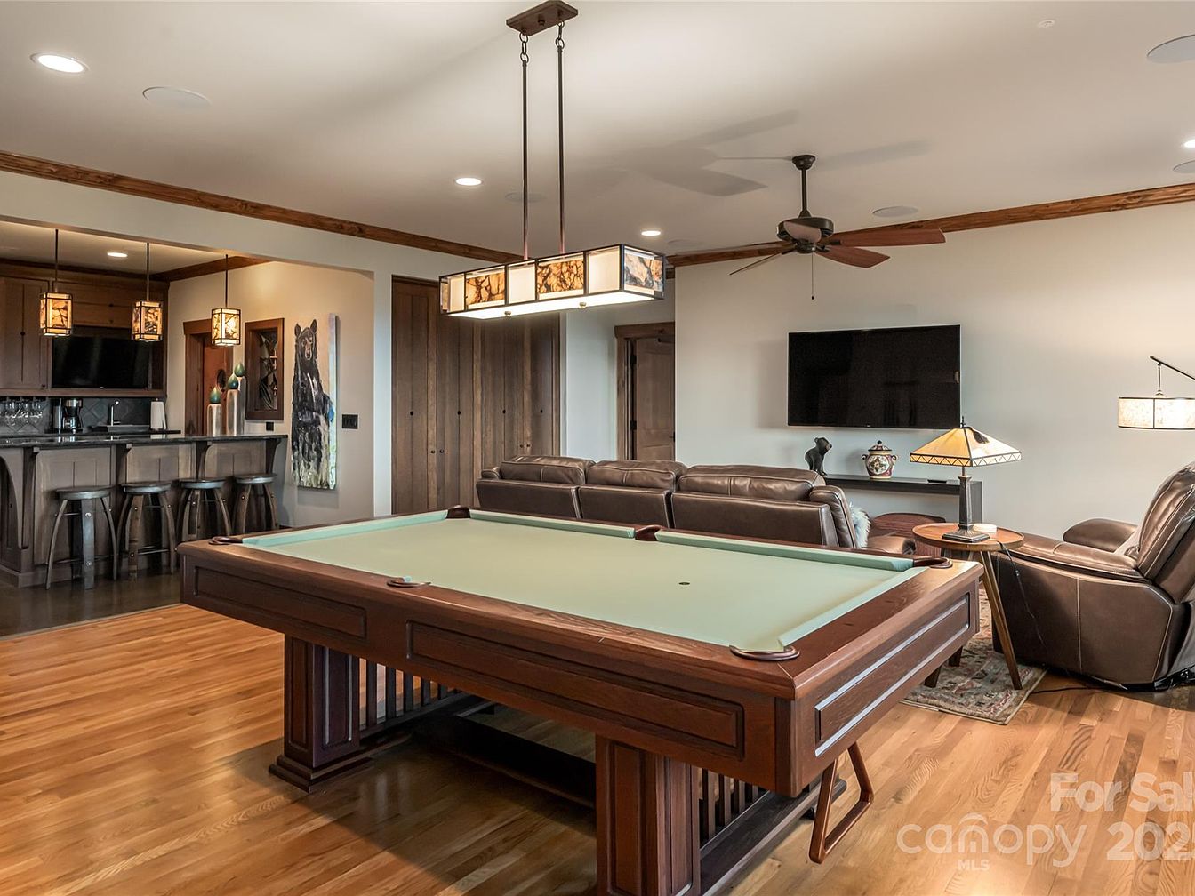 Designed with comfort and entertainment in mind, this spacious game room and lounge features rich wood flooring, warm neutral walls, and inviting earth-toned accents. The centerpiece is a beautiful pool table with a dark wood frame, perfect for friendly family matches. A plush sectional leather sofa is positioned to face a large, wall-mounted television, providing an ideal spot for movie nights or sporting events. The open-plan layout includes a stylish bar area with high-backed stools and unique pendant lighting, making it easy to host gatherings. Wooden architectural elements and tasteful artwork add character, ensuring a cozy, family-friendly setting.
