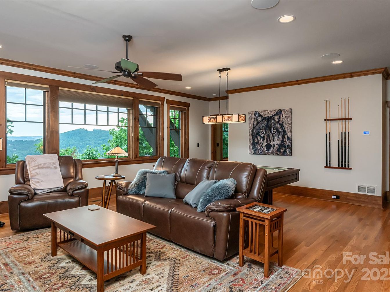A welcoming family room features rich wood trim and expansive windows showcasing breathtaking mountain views, filling the space with natural light. Plush brown leather seating is arranged for conversation and relaxation, while a cozy armchair and throw blanket invite comfort. A pool table, displayed pool cues, and playful wolf artwork offer entertainment and personality, making this a space everyone can enjoy. Warm earth-toned walls, a classic ceiling fan, and an intricate patterned area rug add to the inviting ambiance. The open layout and sturdy furnishings create a family-friendly environment perfect for game nights or quiet evenings together.