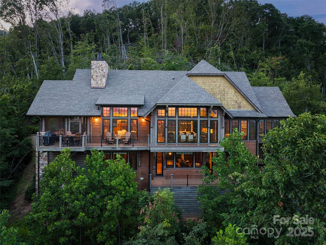 Nestled against a lush backdrop of mature trees, this spacious back deck offers a seamless connection between indoor and outdoor living, perfect for family gatherings and entertaining. The wraparound deck features multiple seating areas with inviting wooden furniture, allowing for tranquil sunset dinners or morning coffee amidst nature. Warm exterior lighting filters through expansive floor-to-ceiling windows, highlighting the craftsman-inspired architecture with stone accents and shingle siding. The home’s muted earth tones and natural textures blend harmoniously with the surrounding forest, while the open layout and broad windows create an airy, inclusive environment ideal for kids and adults alike.
