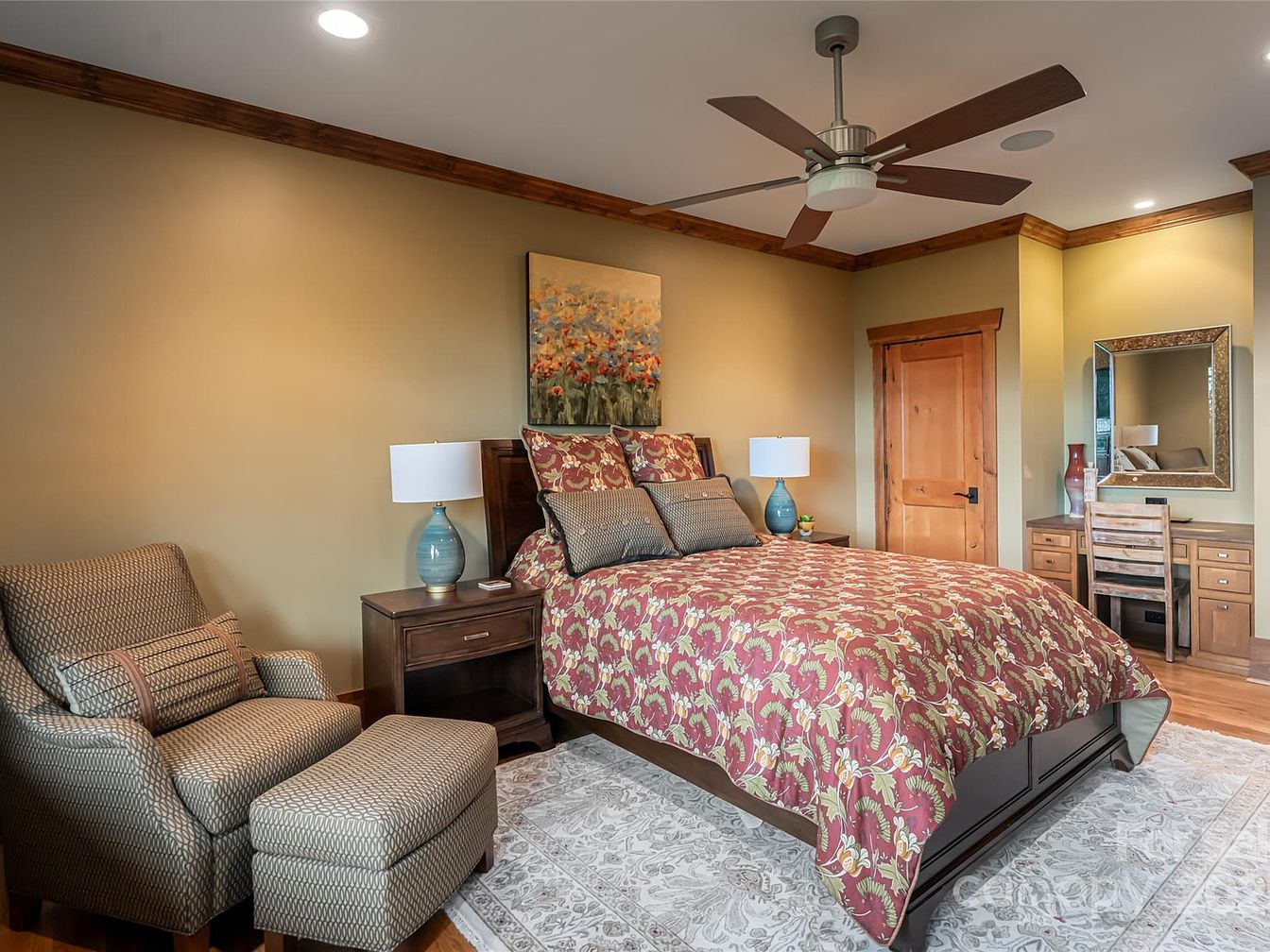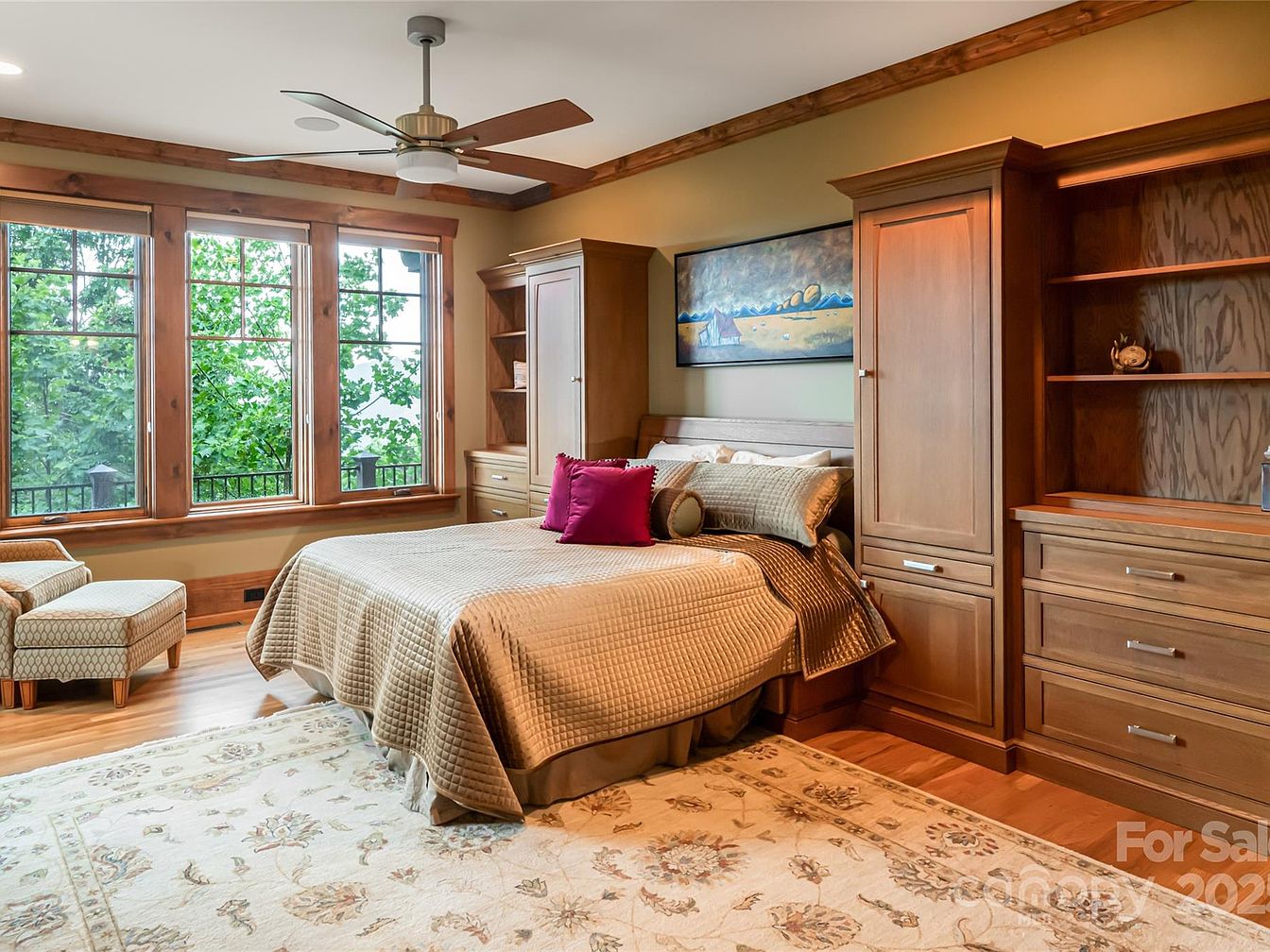 This cozy master bedroom features expansive windows that fill the room with natural light, offering serene views of lush greenery outside. Warm wood trim, custom cabinetry, and built-in shelving showcase quality craftsmanship and provide generous storage, while soft golden walls and a matching comforter set create a calming atmosphere. The ceiling fan and plush armchair with ottoman add comfort, and a large patterned area rug anchors the room, making it welcoming for families. Thoughtful touches like accent pillows bring hints of color, while the overall design blends functionality with inviting rustic elegance.