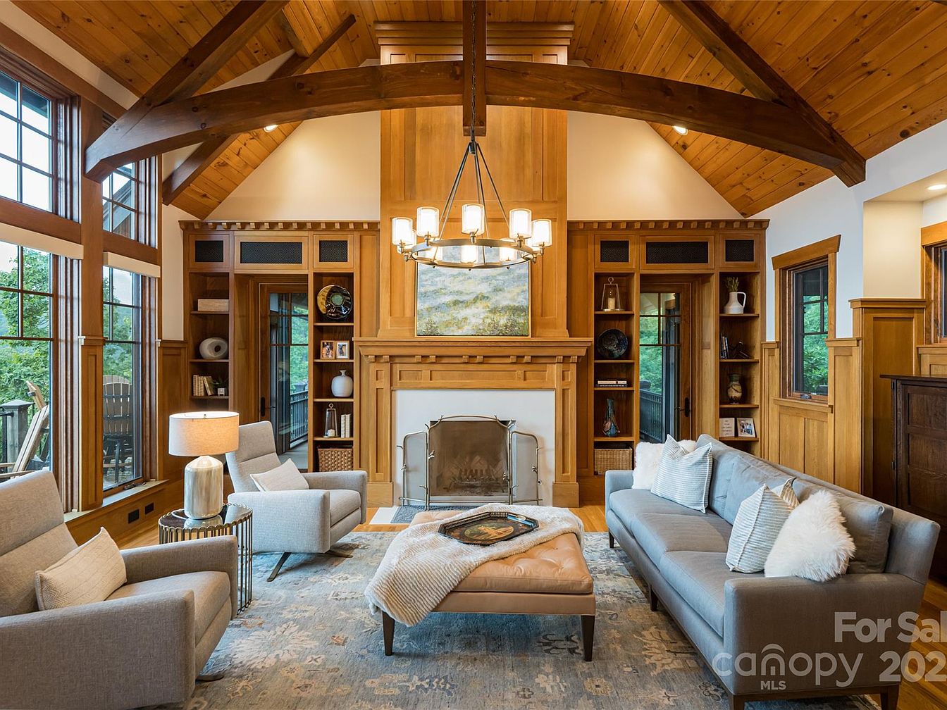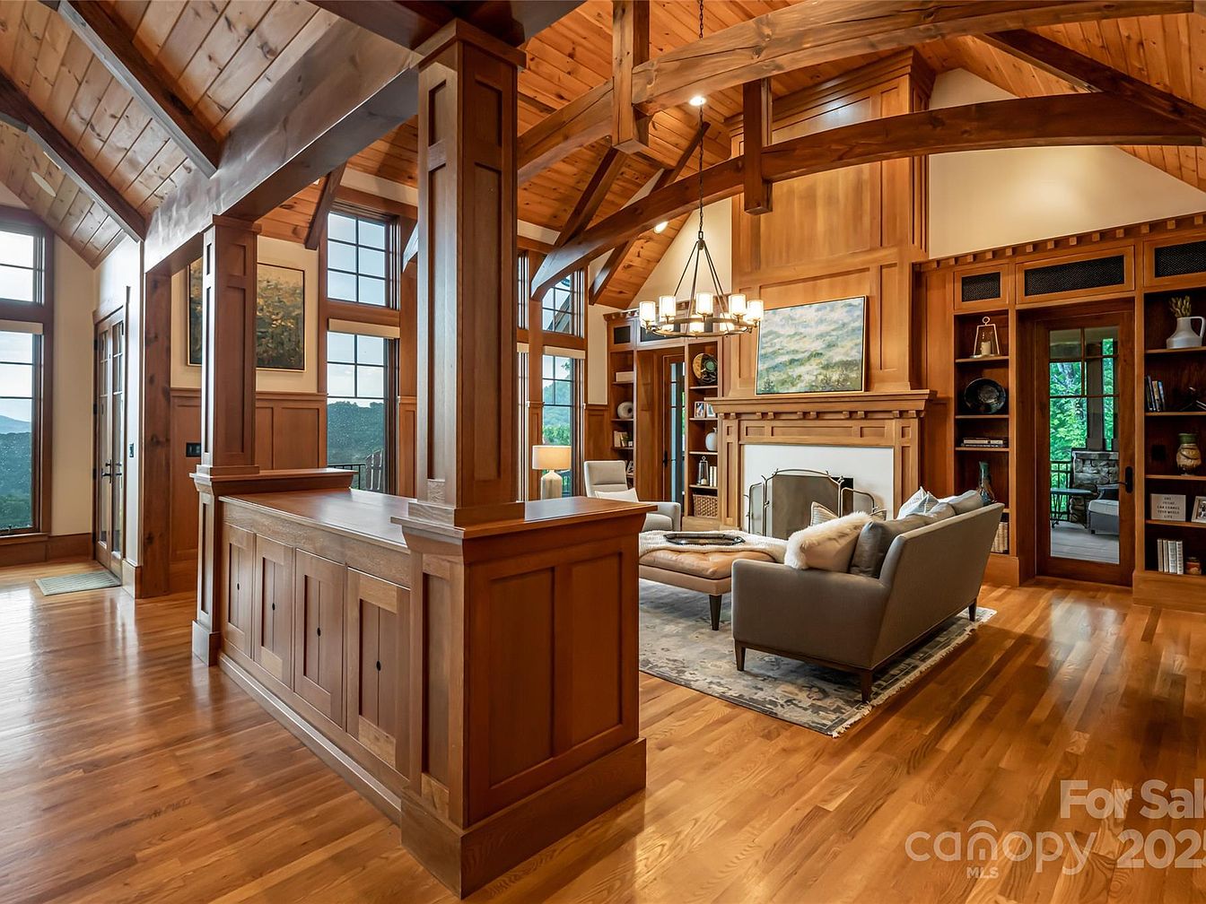 Warmth and architectural elegance greet you at the living room entryway, where rich wood paneling flows seamlessly from the vaulted ceiling down to the hardwood floors. Large windows fill the room with natural light and reveal breathtaking mountain views, making the space both inviting and family-friendly. The open layout promotes engagement between the entry and living area, anchored by a stunning stone fireplace, built-in bookshelves, and plush, neutral furniture perfect for both family gatherings and relaxation. The refined chandelier and soft area rug add cozy touches, balancing comfort and style while subtly showcasing craftsman-inspired details.