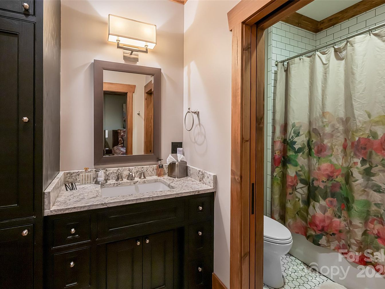 A warm, inviting bathroom combines practicality with comfort through thoughtful design. The dark wood vanity cabinetry features ample storage, complemented by polished nickel fixtures and a granite countertop for a touch of luxury. Overhead, a modern sconce provides ample light above a clean-framed mirror. The adjoining shower area is separated by a sliding wooden door with rich trim, creating both privacy and style. Subway tile and a shower curtain with a soft, floral print add fresh, cheerful accents. The neutral palette and sturdy surfaces ensure durability, making this an ideal, family-friendly space for daily routines.