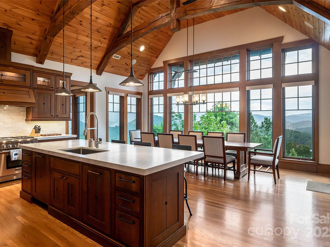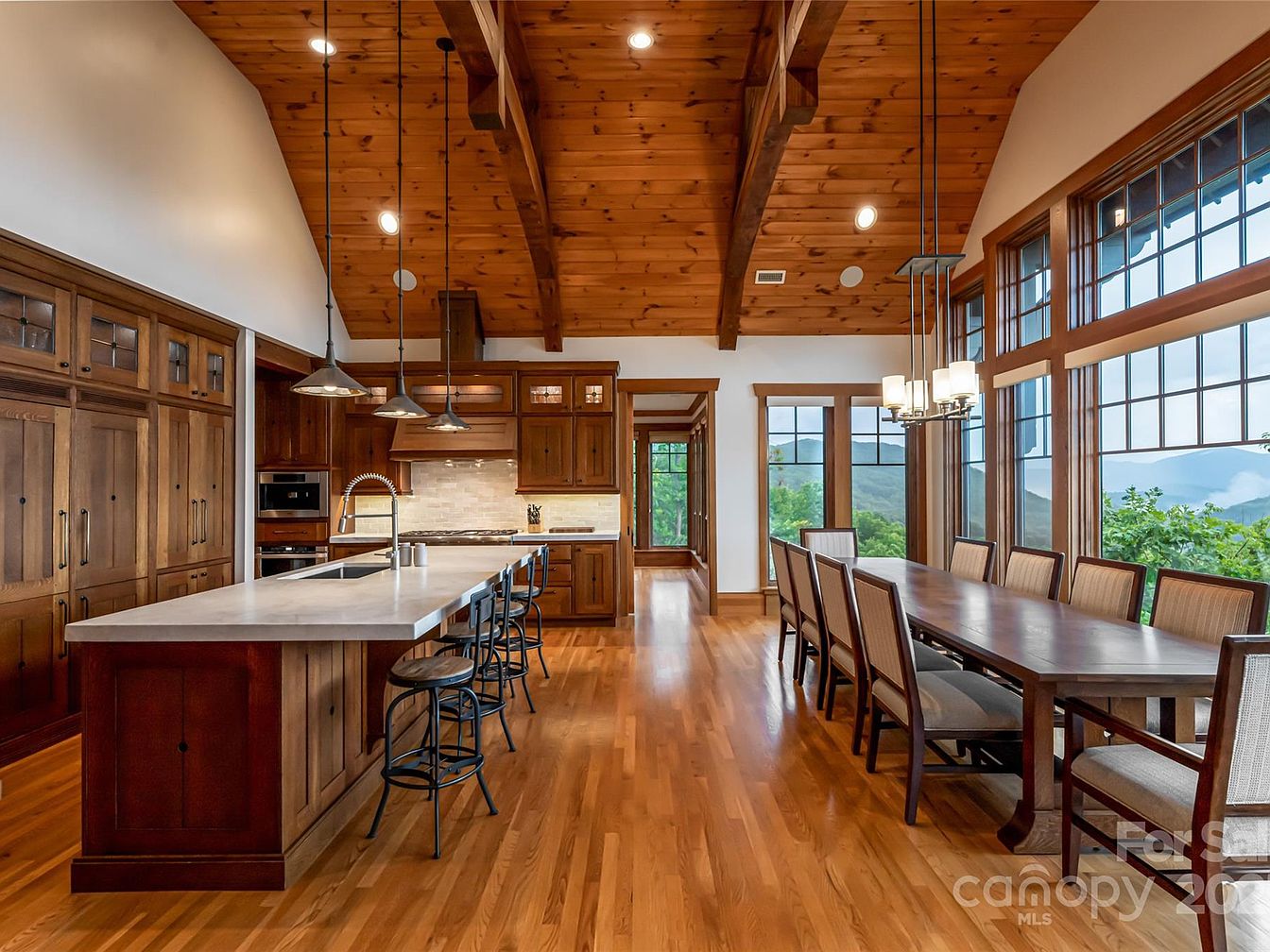 An expansive, open-concept kitchen and dining space blends rustic warmth with modern family comfort. The vaulted, beamed ceiling of natural wood adds a cozy feel while large windows flood the room with natural light and offer breathtaking mountain views. The kitchen features a spacious island with ample seating, sleek countertops, and rich wooden cabinetry that provides plenty of storage for any family. Stainless steel appliances and pendant lighting add elegant touches. Transitioning seamlessly, the dining area showcases a long table perfect for gatherings, making this space ideal for both everyday family life and entertaining guests in style.
