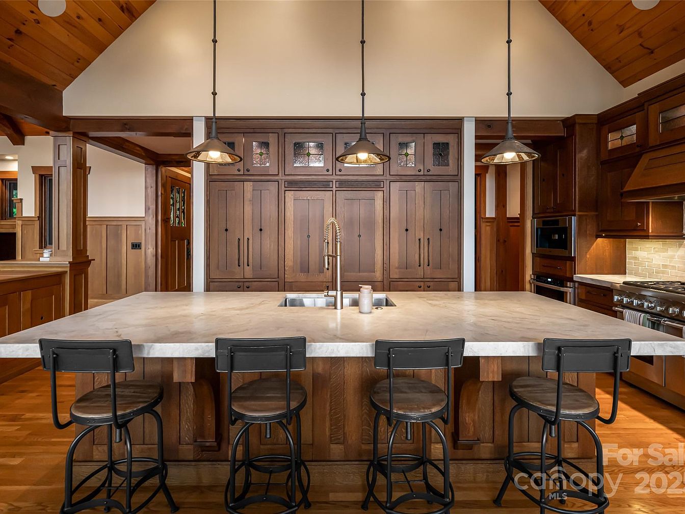 Warm wood tones and striking craftsmanship define this spacious kitchen, with a grand center island topped in sleek marble that provides ample workspace and a casual dining area for family gatherings. Four sturdy barstools offer comfortable seating, fostering togetherness during meal prep or homework sessions. The cabinetry features rich, dark wood with elegant hardware, adding both style and robust storage. Overhead, three pendant lights highlight the island while exposed beams and vaulted ceilings lend a rustic, welcoming charm. Stainless steel appliances and subtle brick backsplash complement the natural textures, creating a balance of modern convenience and timeless appeal.
