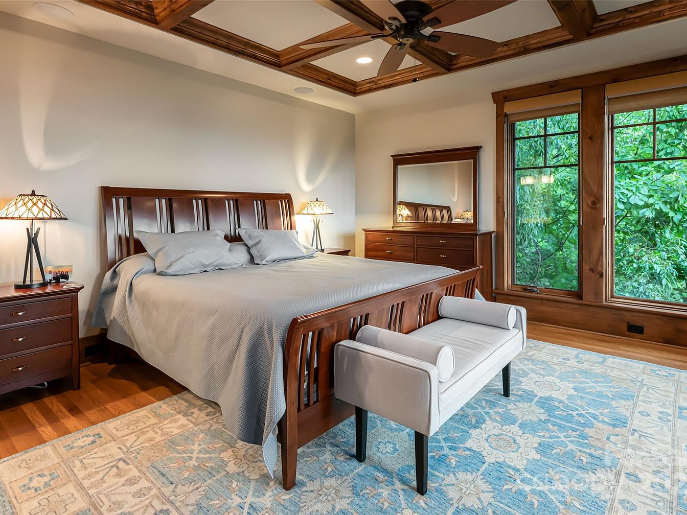 A spacious master bedroom featuring rich wooden accents and a calming view of lush greenery through large picture windows. The room’s centerpiece is a substantial wooden bed framed by matching nightstands and a dresser, offering cohesive style and ample storage. An upholstered bench at the bed’s end adds comfort and convenience, perfect for a reading nook or for relaxing before bedtime. Neutral-toned bedding pairs beautifully with the soft blue and cream patterned area rug, creating a warm and inviting environment. Tasteful, family-friendly lamps provide soft illumination, while the decorative coffered ceiling and wooden floor enhance the cozy, sophisticated ambiance.