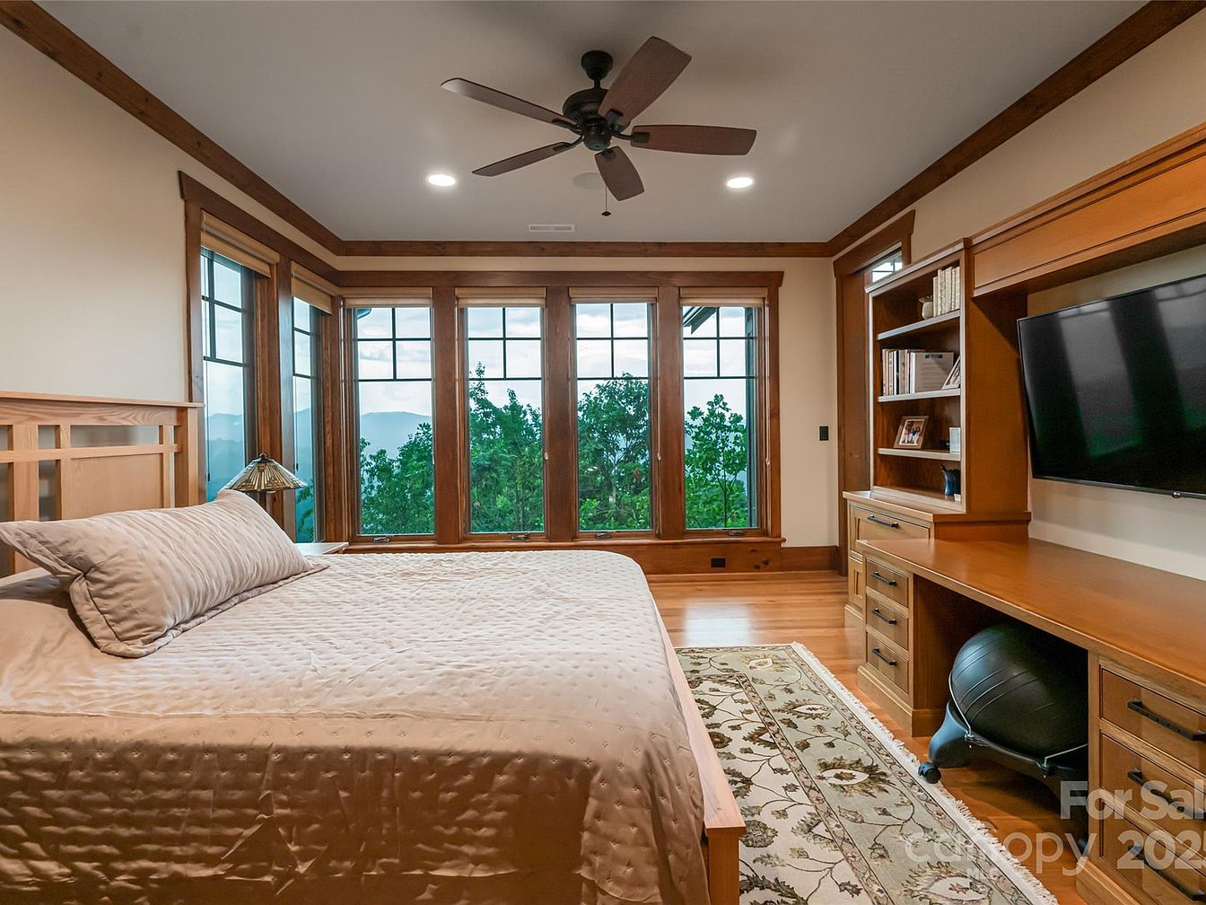 A spacious master bedroom filled with natural light thanks to a wall of large, grid-paneled windows offering stunning views of greenery and mountains beyond. Warm wood accents on window frames, trim, and built-in shelves create a welcoming, cabin-inspired ambiance. The bed, with its simple wooden headboard, is positioned to maximize the views. Family-friendly features include ample storage in the built-in shelving and desk area, perfect for reading or working. Soft neutral tones on bedding and walls contrast beautifully with the honey wood floors and cabinetry, and a ceiling fan provides comfort and coziness for restful nights.
