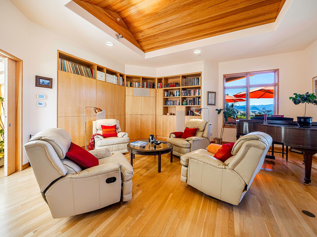 A warm, inviting living room is set with four plush cream recliners arranged in a conversational circle around a central coffee table, making it ideal for family gatherings or entertaining guests. Built-in wooden bookshelves and cabinetry fill one wall, offering abundant storage for books and personal items. The natural light wood flooring and the unique wood tray ceiling add to the bright, airy atmosphere, while pops of red from pillows and throws bring color and comfort. A large window provides gorgeous mountain views and opens the room to the outdoors, where an orange umbrella hints at a connected patio space. A grand piano invites musical evenings.