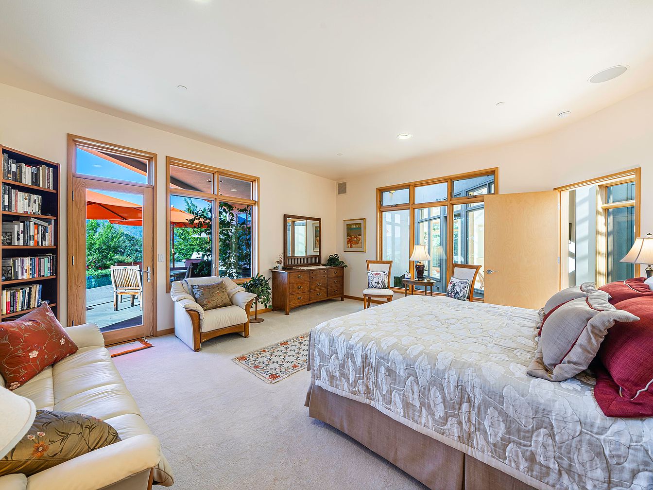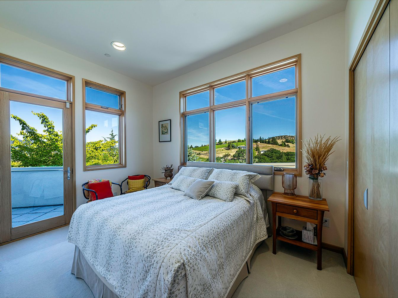 This cozy and inviting bedroom features large windows with beautiful natural wood frames, allowing ample sunlight to pour in and providing breathtaking views of rolling hills and greenery. The neutral color palette with soft cream walls and light bedding promotes relaxation, while minimalist décor, including a side table with dried floral arrangements, adds warmth. Functional and family-friendly touches like the comfortable armchair with colorful pillows provide an inviting spot for reading or quiet moments. Sliding closet doors maximize space and the adjacent door opens onto a patio, perfectly blending indoor comfort with outdoor access for a tranquil retreat.