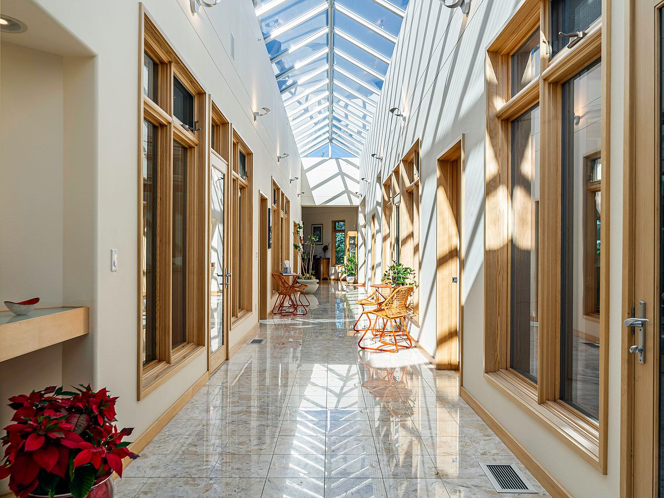 A stunning glass-ceiling hallway filled with natural light, this space is both inviting and functional for family life. The long corridor is lined with large wood-framed windows and doors, enhancing the open, airy feeling and providing views into adjacent rooms. Creamy white walls pair gracefully with the soft beige marble flooring, reflecting sunlight and creating a bright, uplifting atmosphere. Rattan chairs and small tables offer cozy seating spots along the hallway, while touches of greenery and floral accents bring warmth and a welcoming charm. The design prioritizes open sightlines and easy movement, perfect for families and gatherings.