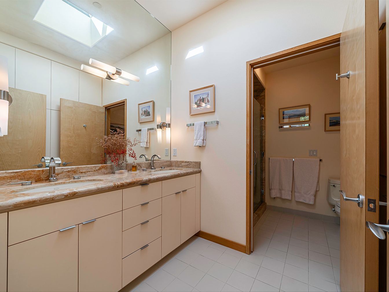 A spacious master bathroom features a double vanity with a sleek marble countertop, offering ample counter space and storage in cream-colored cabinetry. The layout allows for easy movement, making it ideal for families. Contemporary light fixtures and a large mirror enhance the sense of space, while natural light pours in from a skylight above. Soft beige walls, light tiled floors, and wooden door accents create a warm yet modern aesthetic. Decorative touches, such as framed artwork and a vase with dried florals, add personality. The adjoining private water closet and shower area ensure comfort and functionality for daily routines.