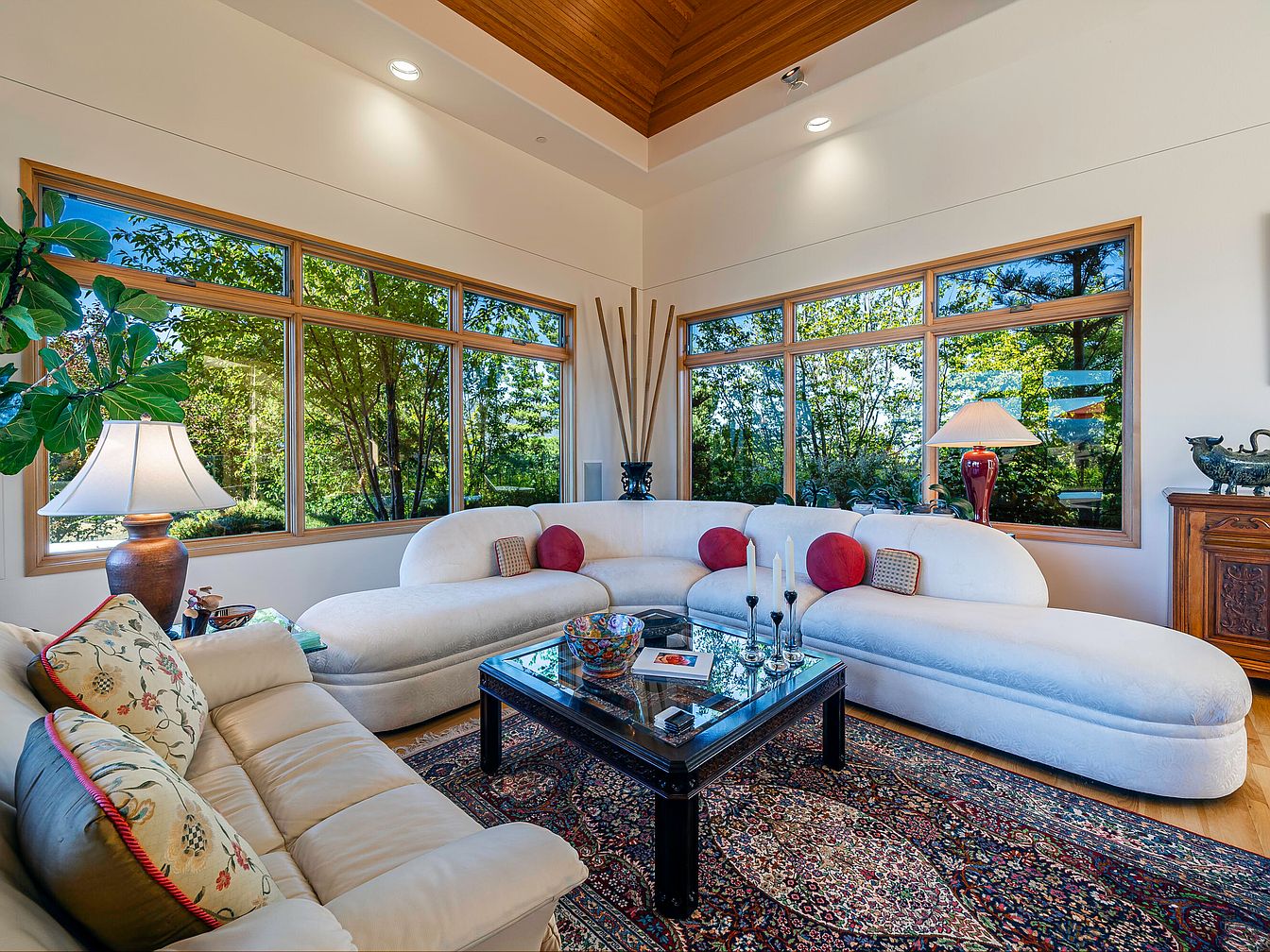 A spacious family living room warmly welcomes with its oversized, curved white sectional and inviting cream leather sofa. Floor-to-ceiling windows bathe the space in natural light while offering scenic views of the lush outdoors, seamlessly blending inside and out. Accents of wood trim and a richly toned ceiling add warmth and sophistication. The decor includes a classic patterned rug, bold red throw pillows, and ornamental pieces atop a solid wood cabinet and glass coffee table, infusing the room with personality. Thoughtful placement of table lamps and greenery completes the cozy, family-friendly atmosphere, ideal for gatherings and relaxation.