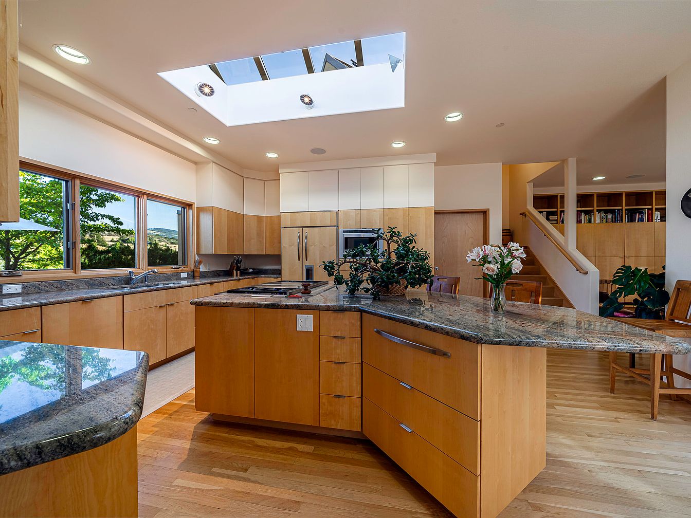 A light-filled kitchen boasts a spacious island with a sweeping granite countertop that doubles as a casual dining space, perfect for family gatherings or homework sessions while meals are being prepared. The layout is open and airy, featuring honey-toned wood cabinetry and sleek stainless steel appliances. Large windows offer abundant natural light and serene views of greenery, enhancing the sense of warmth. Overhead, a skylight floods the area with sunshine, creating an inviting atmosphere. Adjacent open shelving and a visible staircase suggest seamless flow to living areas, ensuring the kitchen remains the heart of this stylish, family-friendly home.