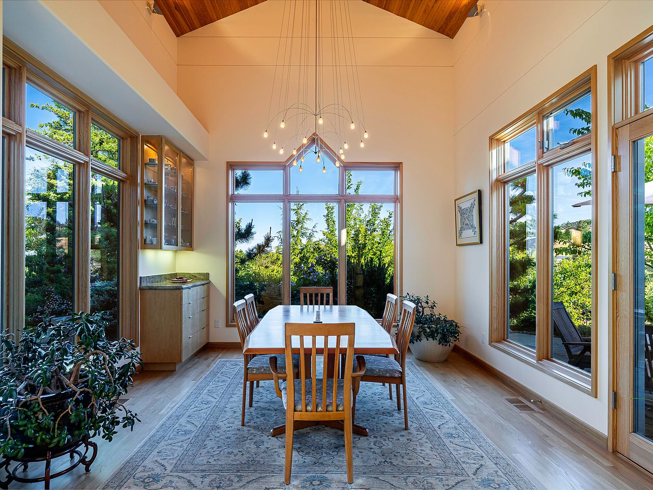 A spacious dining room filled with natural light thanks to expansive windows that offer panoramic views of surrounding greenery. The high, wood-paneled ceiling brings warmth and a hint of rustic elegance, while contemporary pendant lighting creates an inviting ambiance for family meals or gatherings. Neutral walls complement the light wood finishes on the trim, cabinetry, and floors, providing a cohesive and calming environment. The long wooden table, with ample seating, encourages family togetherness, and the presence of leafy plants softens the space, making it both welcoming and family friendly. Built-in cabinetry provides practical storage for dinnerware and essentials.