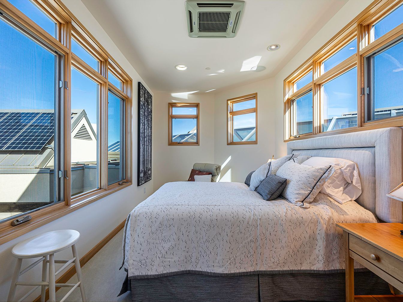Flooded with natural light from expansive windows framed in warm wood, this inviting bedroom combines modern comfort with cozy elements. The neutral palette, soft whites, greys, and subtle wood tones, provides a calming atmosphere, making it ideal for unwinding. The plush upholstered bed, dressed in patterned bedding and layered pillows, creates a restful centerpiece, while a wooden nightstand and a white stool add practical touches. Attention to airflow and comfort is evident with ceiling ventilation and ample window openings. The nook’s bright openness and uncluttered layout make it perfect for families, offering both relaxation and a view of the outdoors.