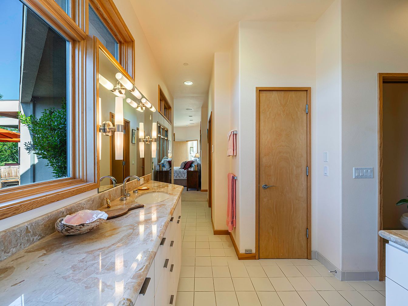 Spacious and inviting, this double-sink bathroom vanity features a stunning marble countertop, ample cabinetry, and large windows that flood the space with natural light. The neutral palette of cream and light wood tones creates a calming, family-friendly atmosphere, ideal for busy mornings or winding down in the evening. Sleek modern light fixtures frame the expansive mirror, enhancing both elegance and functionality. Practical touches include multiple towel racks and easy-to-clean tile flooring. A seamless flow connects the vanity to the rest of the home, making it accessible and convenient for families while maintaining a sense of sophisticated privacy and comfort.