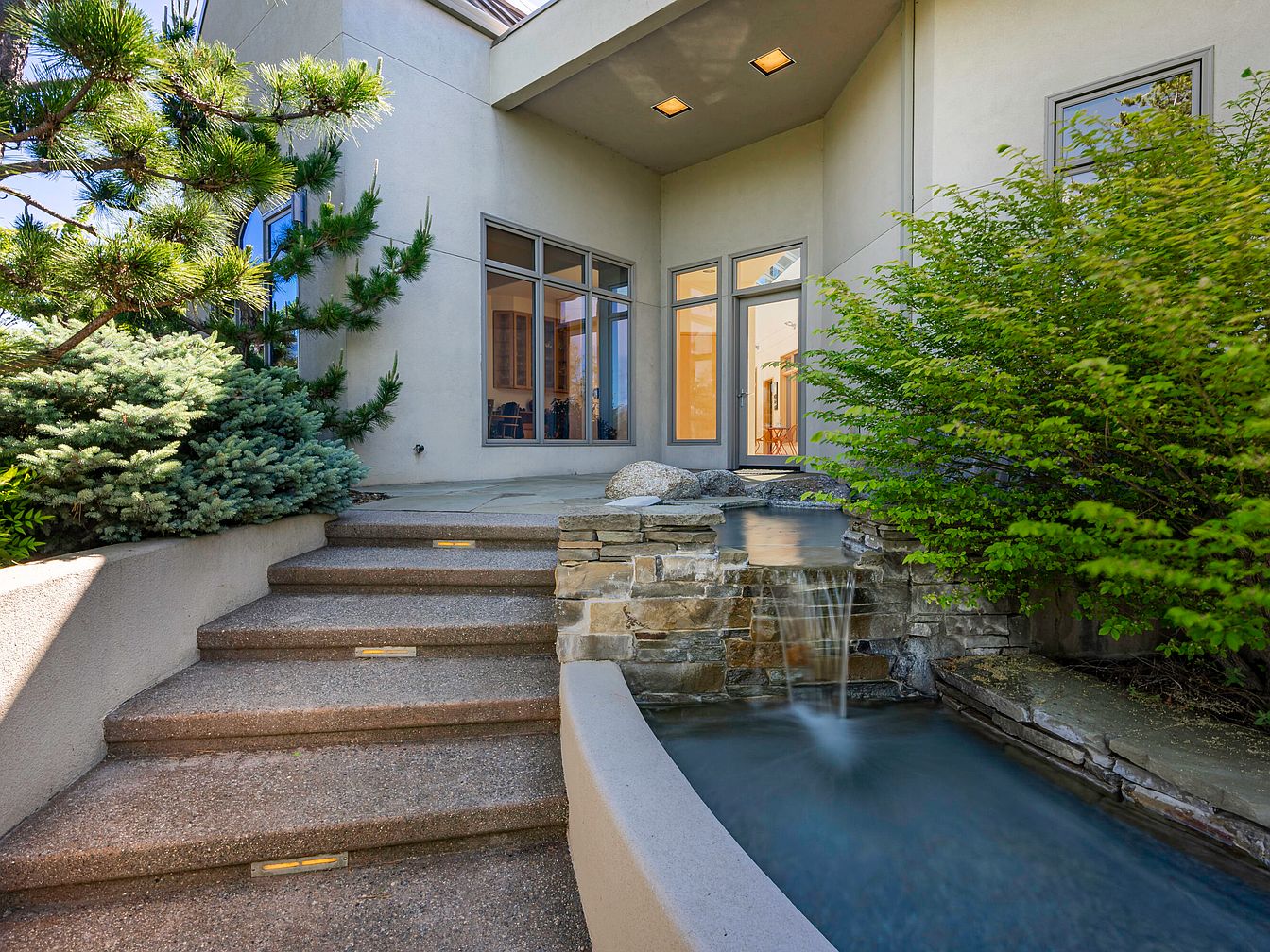 A tranquil garden entryway welcomes visitors with gentle, textured concrete steps bordered by lush green shrubs and artfully placed evergreens. The architectural lines of the light gray exterior provide a modern, clean backdrop, while expansive windows and double glass doors invite natural light and offer seamless integration between indoor and outdoor spaces. A striking water feature with a stone waterfall adds a peaceful ambiance, perfect for families seeking a calming environment. Subtle pathway lighting ensures safety for all ages, making this space both visually appealing and family-friendly. Thoughtfully designed landscaping creates a harmonious balance of nature and architecture.