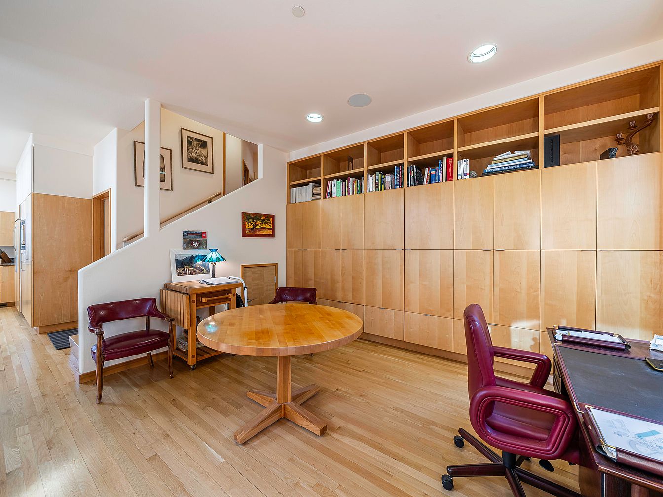 A spacious, light-filled home office featuring custom-built wooden cabinetry that covers an entire wall for ample storage and display space, ideal for keeping the room organized for the whole family. Sleek, pale hardwood floors and matching wood finishes unify the space, while recessed lighting and a couple of accent lamps ensure a bright, welcoming environment. The furnishings include a round table for collaborative activities or meetings, burgundy leather chairs, and a large executive desk, all arranged to encourage both productivity and comfort. Natural wood tones and light neutral walls create a warm and sophisticated aesthetic suitable for work or study.