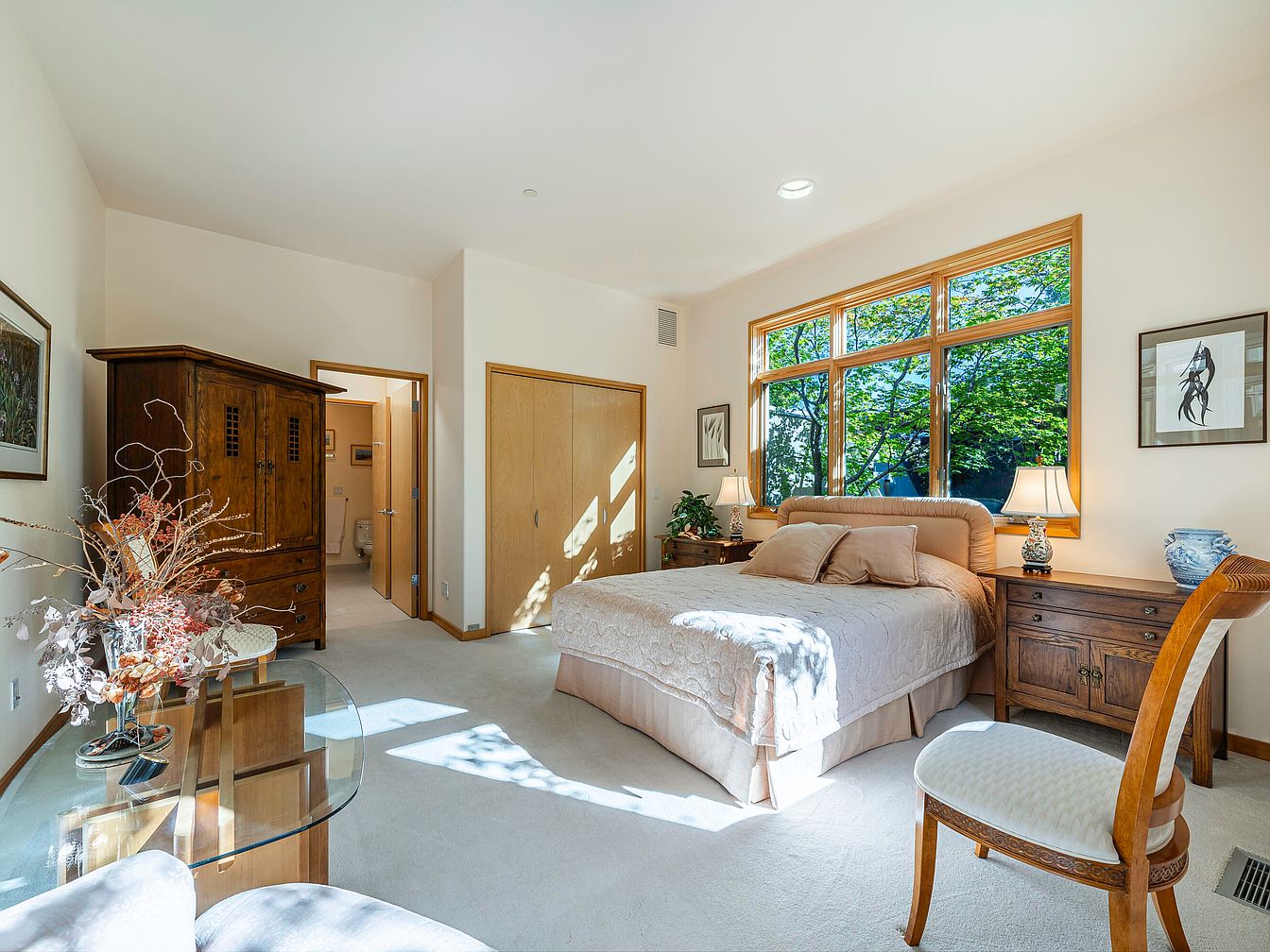 Flooded with natural light from a wide set of picture windows, this master bedroom offers a tranquil oasis that feels spacious and welcoming. Creamy walls and neutral carpeting serve as a soothing backdrop, while honey-toned wood window trims and matching classic furniture add warmth and character. A large, plush bed with soft bedding anchors the space, flanked by twin wooden nightstands topped with elegant lamps. The room features a cozy reading nook with a glass table and ornate floral arrangement, perfect for relaxation. Double doors lead to a private ensuite, enhancing convenience for families seeking comfort and privacy.