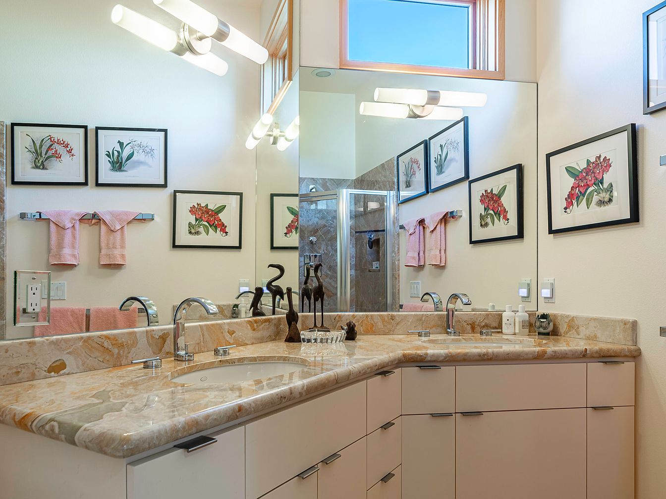 A beautifully designed bathroom vanity corner features a luxurious multi-tone stone countertop with dual sinks and sleek chrome fixtures, perfect for families sharing the space. The cabinetry is minimalist, finished in a light tone that brightens the room and provides ample storage. Large mirrors enhance light and give a sense of spaciousness. The walls are adorned with elegant, botanical artwork in black frames, adding personality and color while matching soft pink towels contribute a gentle, welcoming touch. Overhead lighting fixtures provide a modern touch and ensure the space remains well-lit, comfortable, and inviting for daily routines.