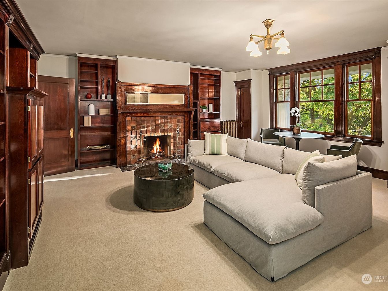 A warm and inviting living room centers around a classic brick fireplace with dark wood built-ins on either side, providing both elegant display space and practical storage. The neutral color palette, led by soft beige walls and plush carpeting, is complemented by rich, glossy woodwork framing the doorways, windows, and shelves. A large, comfortable sectional sofa forms an ideal spot for family lounging, while the round coffee table adds a touch of modern style. Sunlight pours through a bank of large windows set above a cozy nook with a small dining table, perfect for family gatherings or quiet mornings overlooking the greenery outside.