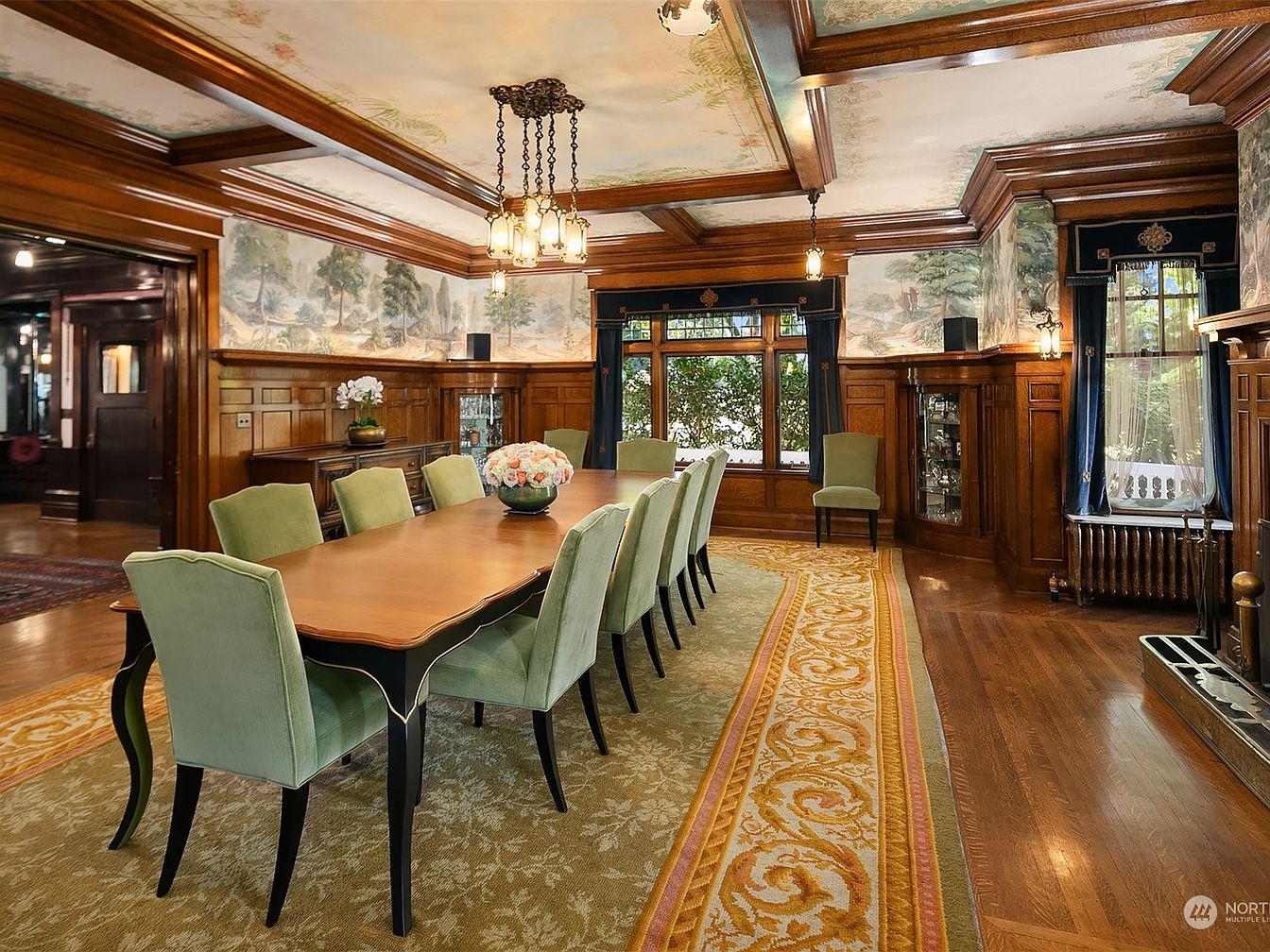 A grand formal dining room showcases elegant wood paneling, intricate ceiling beams, and expansive windows that bathe the space in natural light. The long, polished table comfortably seats ten, surrounded by plush sage green chairs for family gatherings and entertaining guests. The classic floral area rug adds warmth and defines the space, while the ornate light fixtures above bring a sense of timeless charm. Beautiful wall murals and rich drapery lend a refined, yet inviting touch to the room. Architectural details such as built-in cabinetry and detailed trim make it both practical and perfect for family meals or celebrations.