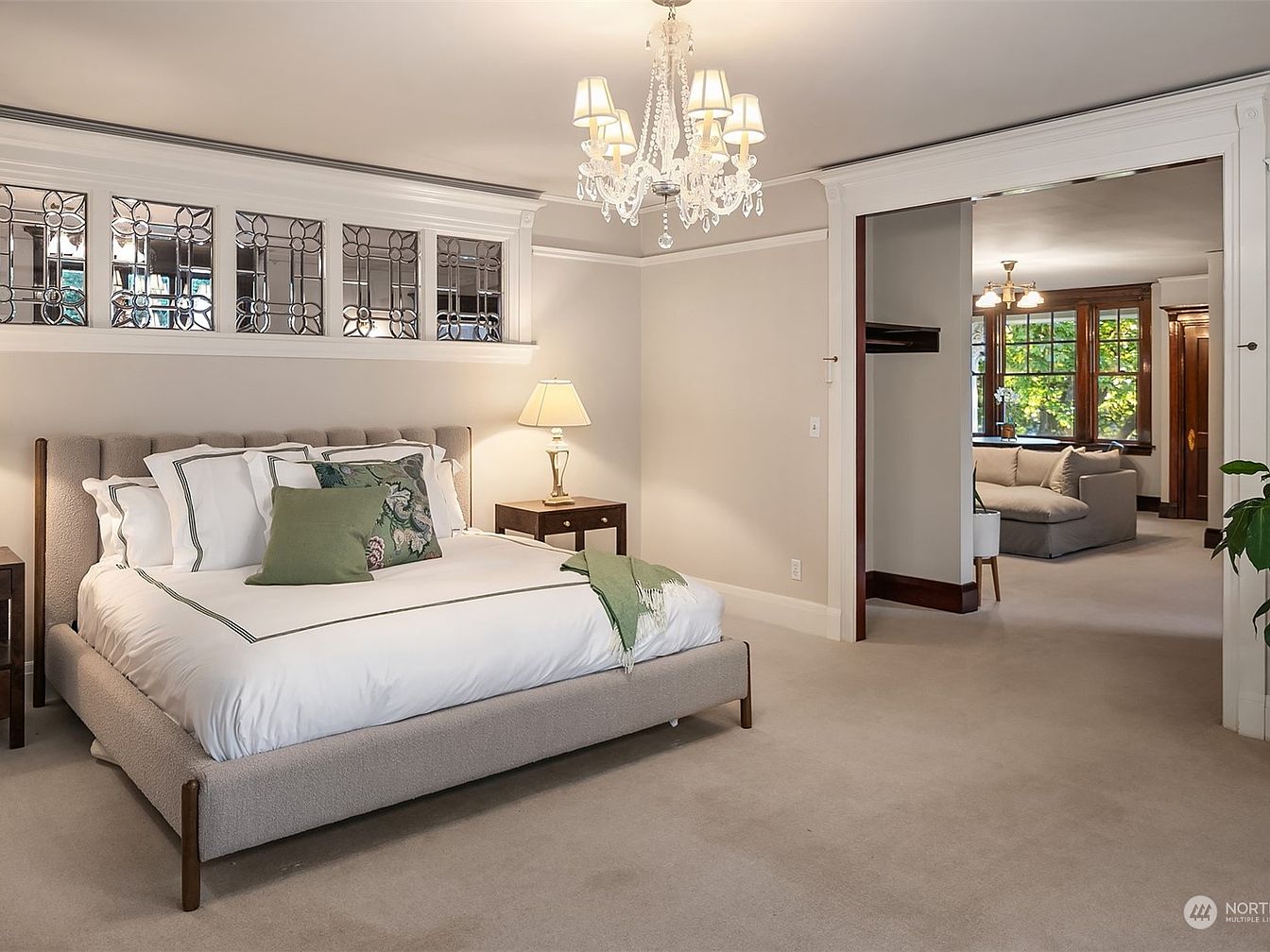 A spacious master bedroom features a plush upholstered bed adorned with crisp white linens, green accent pillows, and a floral cushion for a touch of nature. Soft neutral carpeting creates a calming atmosphere, perfect for relaxation. Elegant stained glass windows above the bed add unique character and refined charm. The room’s subtle beige walls and white trim promote a fresh, airy feel, while a classic chandelier enhances the sense of luxury. Two simple nightstands flank the bed, illuminated by a traditional table lamp. Large open doorways lead seamlessly into an inviting sitting area, ideal for family gatherings or quiet moments.