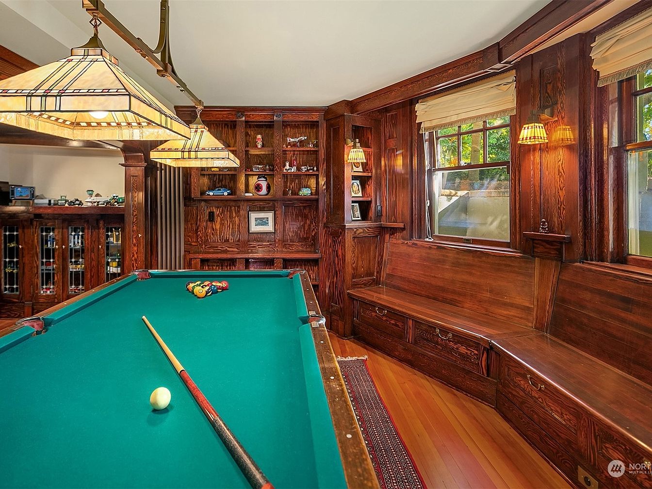 A welcoming game room centered around a classic green-felt pool table, enhanced by richly stained wood paneling that exudes warmth and timeless character. Custom-built wooden benches with integrated storage run along the windows, offering ample seating for family and guests. Natural light pours in through the multi-pane windows, complemented by elegant, arts-and-crafts style pendant lighting and cozy wall sconces. A wall of built-in shelves and cabinetry provides space for keepsakes, games, and collectibles. This inviting space is perfect for gatherings, encouraging both interaction and relaxation in a family-friendly, sophisticated setting.