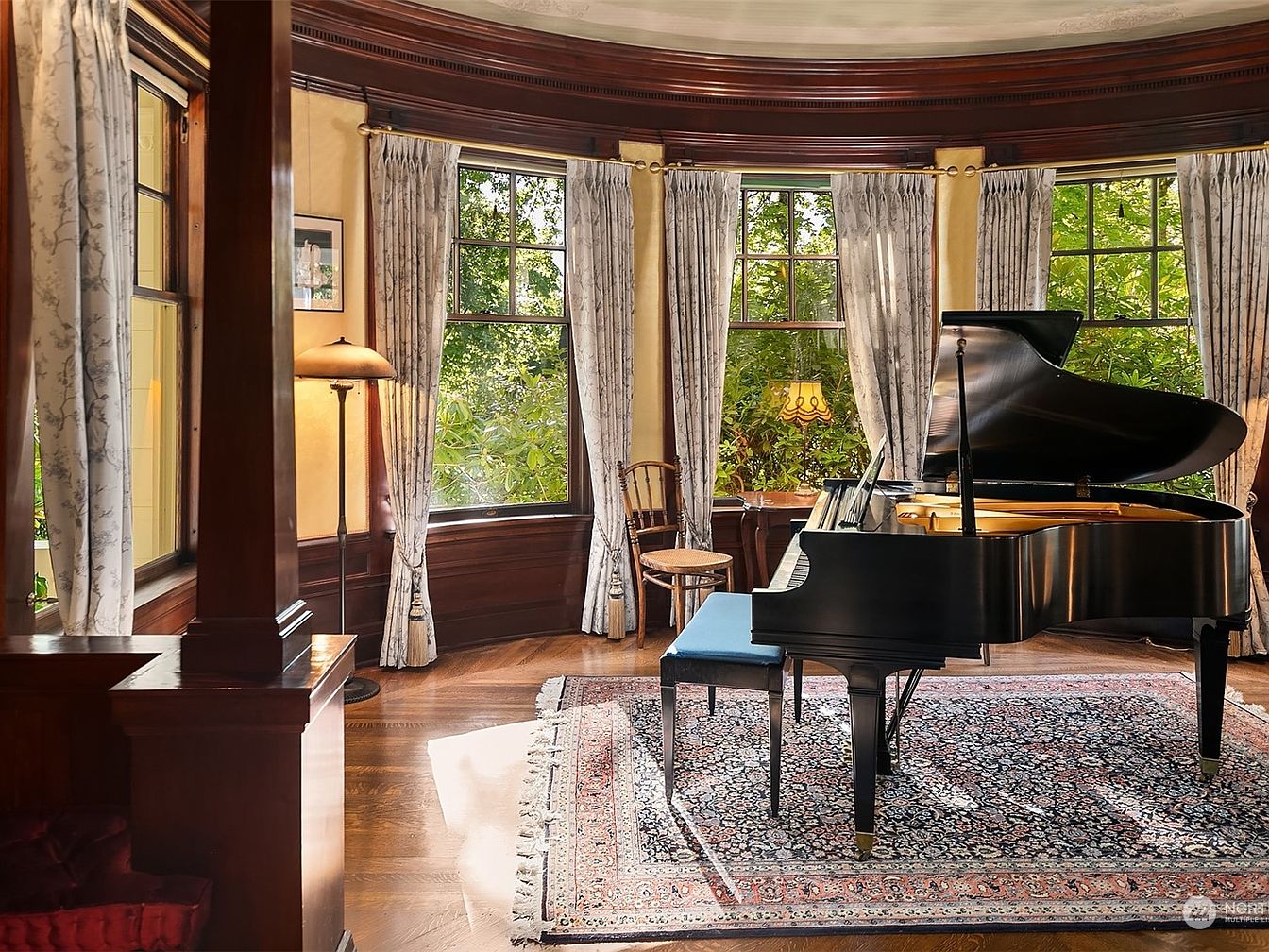 A stunning, light-filled piano room features a grand piano as the centerpiece, set atop a detailed oriental rug that adds texture and warmth. Large bay windows with elegant patterned drapes invite ample natural light and frame lush outdoor greenery, creating a cozy and inspiring environment for family gatherings or quiet creativity. Rich wood trim and paneling provide architectural sophistication, complemented by period-appropriate furnishings such as a classic wooden side chair and vintage lamp. Soft, muted wall colors balance the room’s grandeur, making it welcoming for both adults and children and offering a perfect space for music and connection.