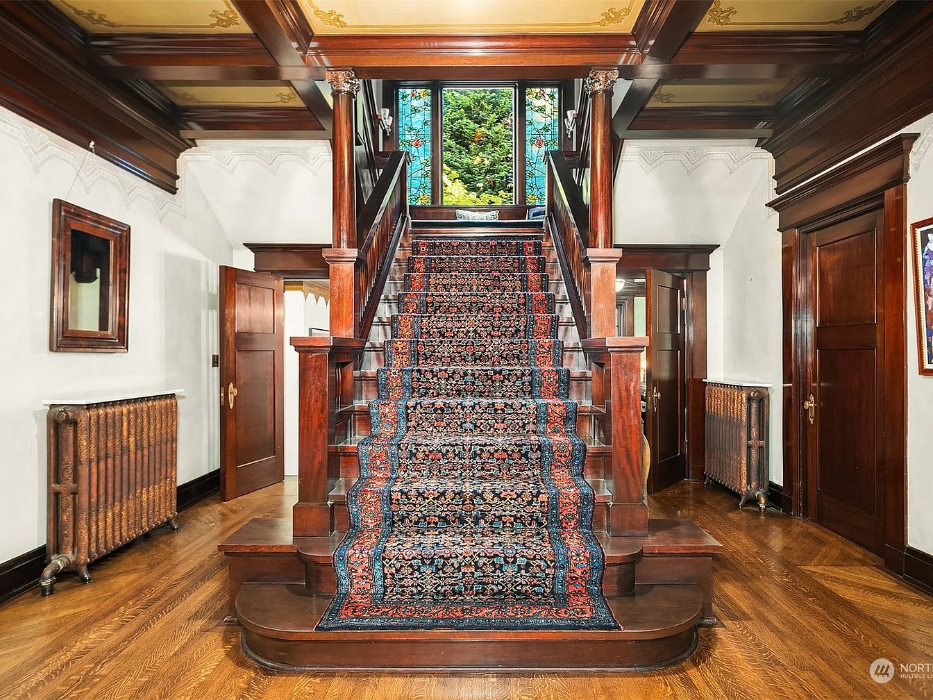 An inviting entryway welcomes guests with an eye-catching staircase as its centerpiece, featuring rich, dark woodwork and a patterned, oriental-style runner ascending to a bright stained-glass window. The coffered ceiling with intricate crown moldings and subtle gold accents complements the space’s traditional elegance. Polished hardwood floors set a warm foundation, while framed mirrors and artwork on the walls add personal touches. Family-friendly touches include sturdy banisters, broad steps, and ample space to transition between rooms, perfect for busy households. Heating radiators blend seamlessly with the vintage character, ensuring comfort for all residents year-round.
