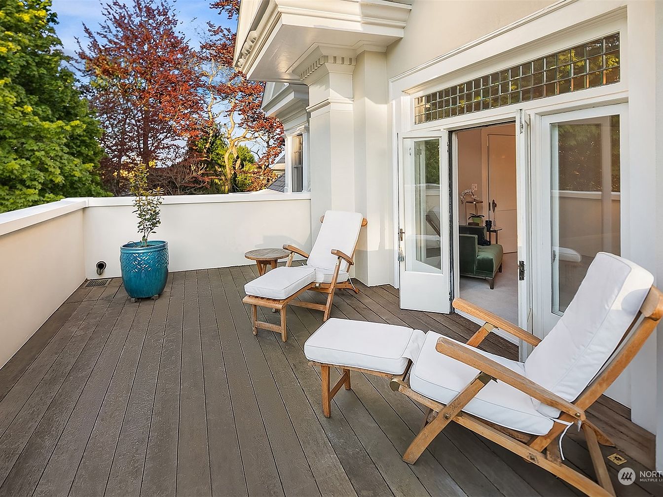 A spacious balcony designed for both relaxation and social gatherings, featuring a charming wood-plank floor and soft cream-colored exterior walls for a soothing, inviting atmosphere. Two wooden lounge chairs with plush white cushions offer comfortable seating ideal for morning coffee or evening unwinding, while a small side table adds function. A vibrant blue ceramic planter with greenery enhances the natural, fresh vibe. The wide French doors with glass panels allow seamless indoor-outdoor flow, ensuring plenty of natural light filters in. The high, secure railing provides safety for families, making it a perfect space for everyone to enjoy outdoor living.