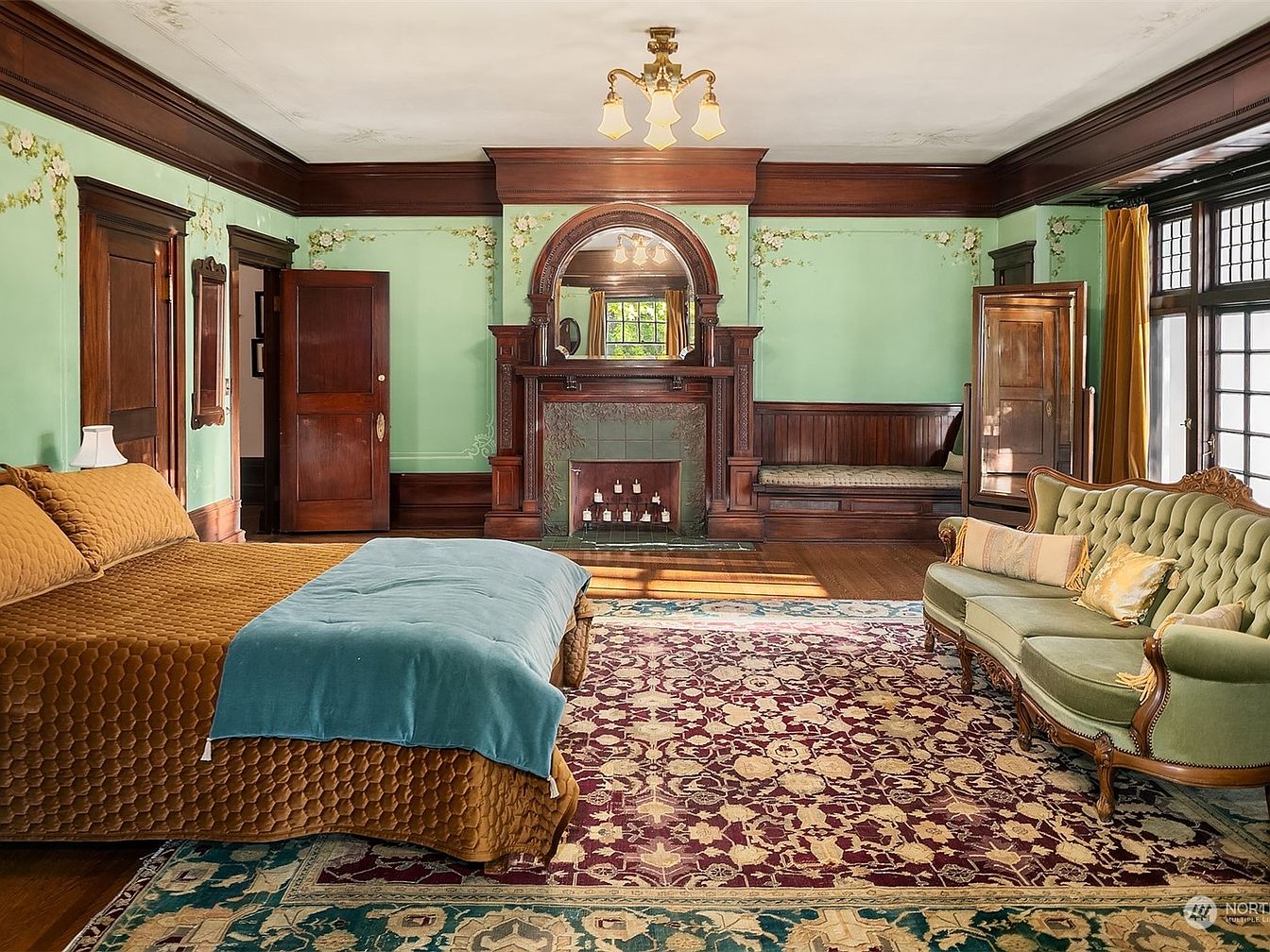 Spacious and inviting, this master bedroom combines historic charm with luxurious comfort. Rich dark wood trim frames mint green walls adorned with delicate botanical stenciling, creating a soft and welcoming atmosphere. An ornate fireplace becomes the focal point, flanked by a cozy built-in window bench, ideal for family reading time. The room features an elegant vintage sofa and a plush king-sized bed with a textured bronze coverlet, complemented by a patterned area rug in jewel hues. Generous windows fill the space with light, and ample floor space ensures comfort, relaxation, and room for children to play safely nearby.