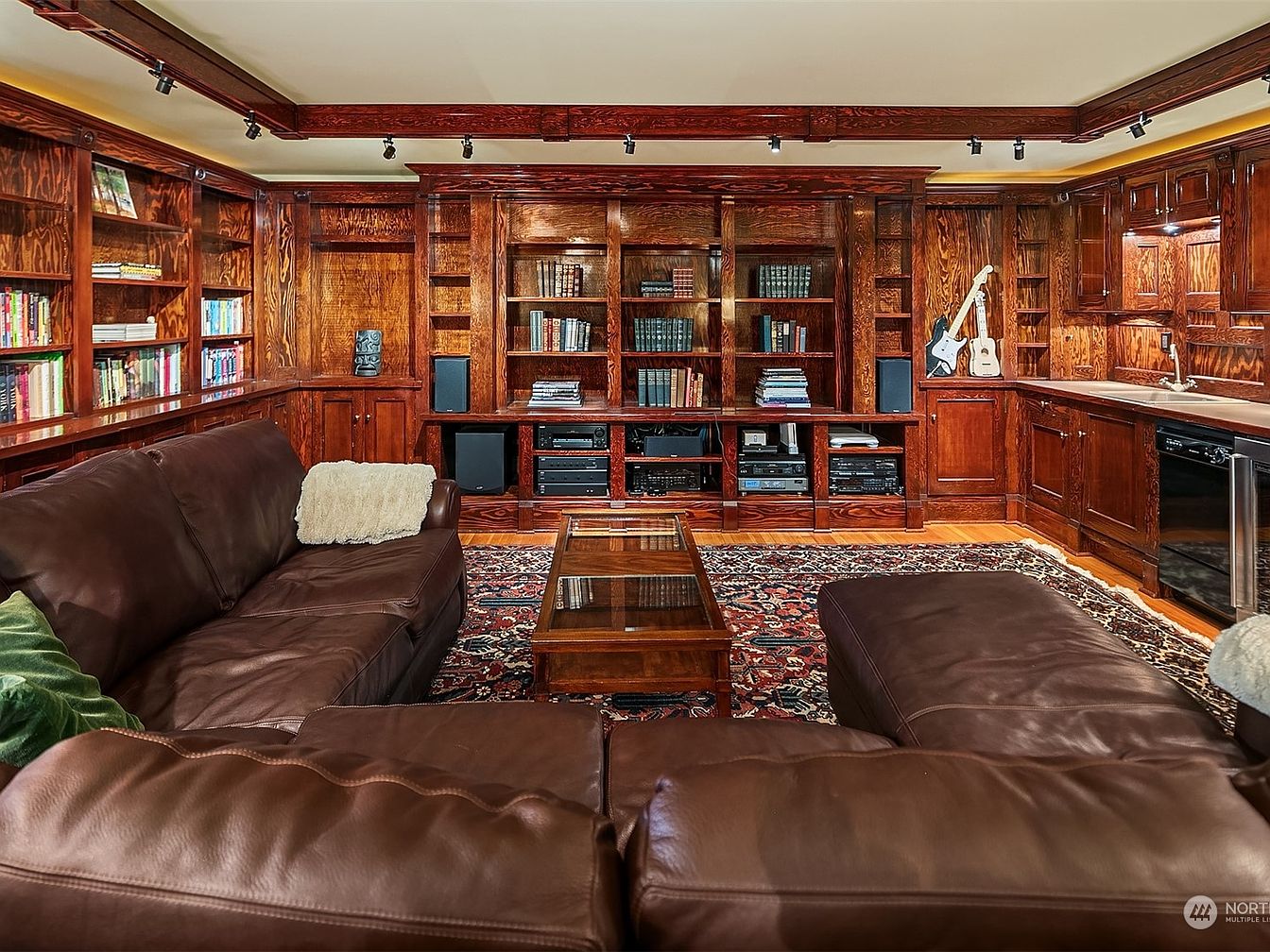 A warm and inviting library lounge features built-in wooden bookshelves that span the entire back wall, displaying a well-curated selection of books and media. Dark brown leather sectional sofas provide ample comfortable seating for families to gather, while a classic patterned rug anchors the cozy space. The wooden coffee table at the center complements the rich, reddish woodwork and cabinetry, which extends to a corner kitchenette with a sink and dishwasher for convenience. Overhead track lighting enhances the inviting atmosphere, making this a perfect multi-purpose room for reading, games, and relaxation together as a family.