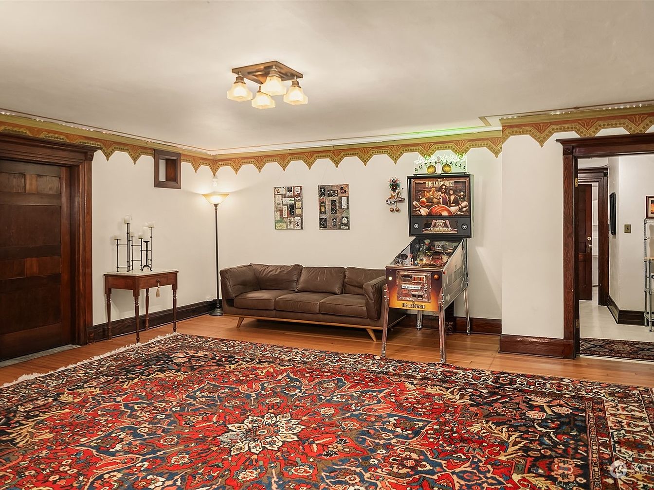 A spacious game room with a warm and inviting feel, featuring an intricately patterned area rug in rich reds and blues that anchors the space. The room combines modern comfort with classic charm, highlighted by a brown leather sofa, vintage wooden trim, and crown molding adorned with a unique decorative motif. Family-friendly elements include a pinball machine for entertainment and wall art for personality. The soft lighting from a floor lamp and overhead fixture creates a cozy atmosphere, making it an ideal spot for gathering and relaxation. Hardwood floors add elegance, balancing playfulness and sophistication.